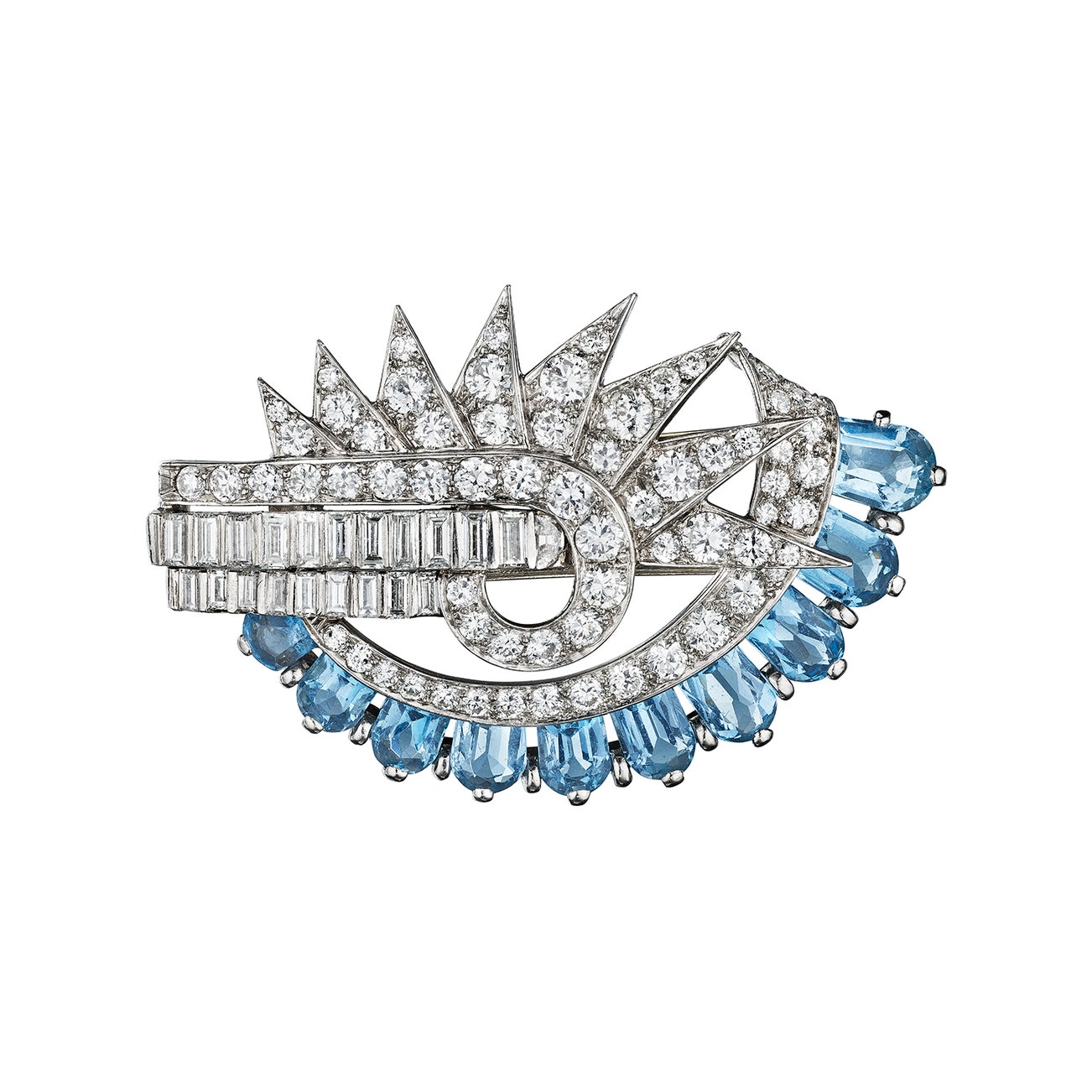 An Art Deco eye motif set with circular-cut, baguette, and half-moon-shaped diamonds, accented by a graduated row of fancy-shaped aquamarines, mounted in platinum.