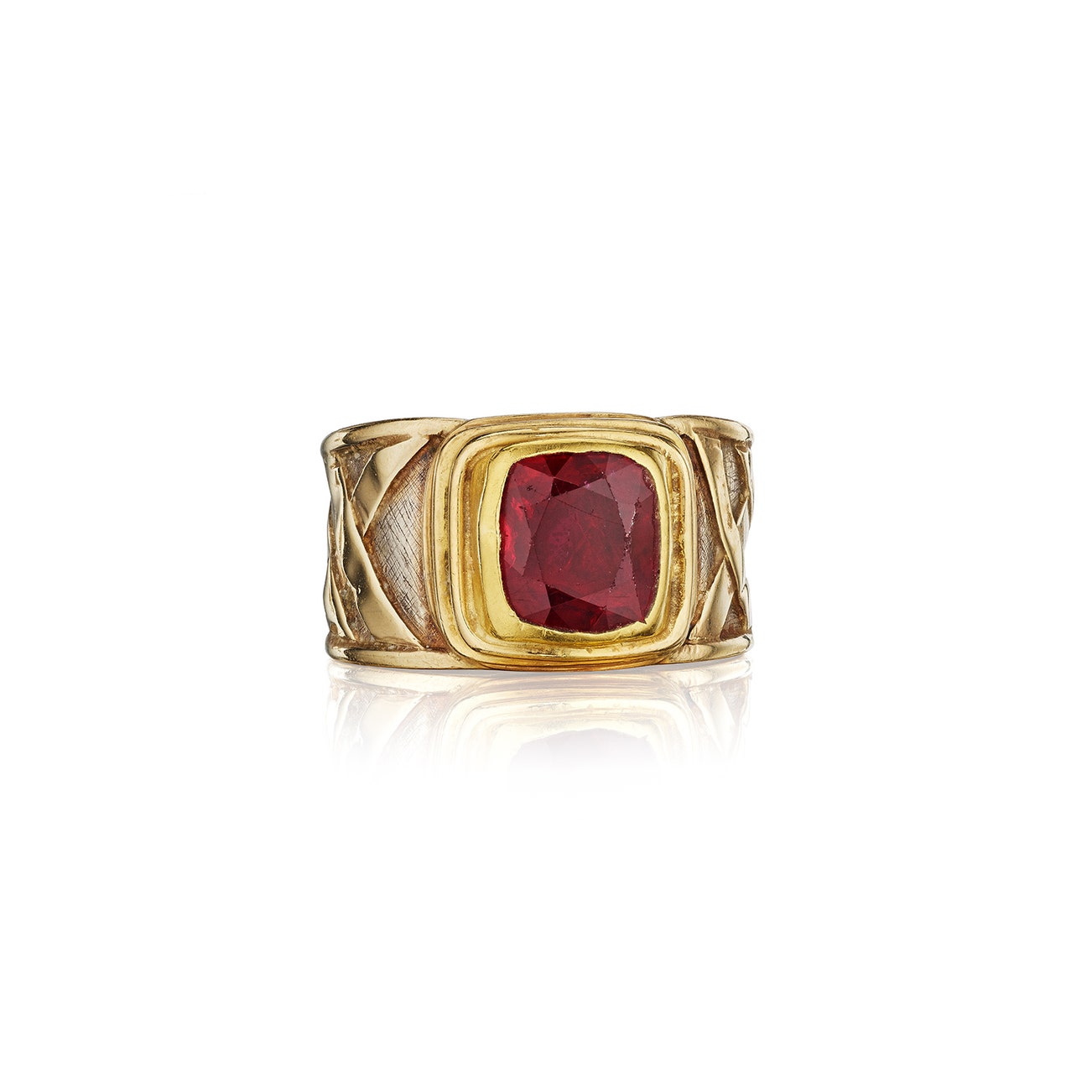 Set with a cushion-shaped ruby, mounted in 14K yellow gold and silver, size 10.