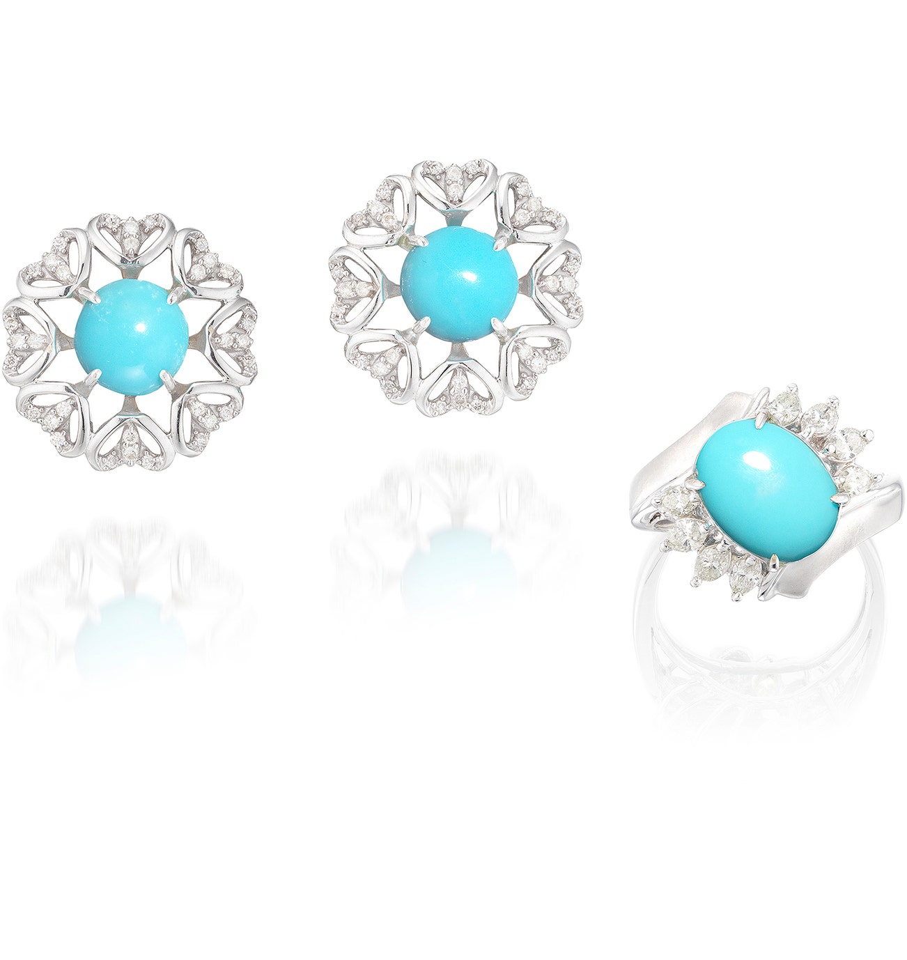 Comprising: a pair of earrings, each set with a round cabochon turquoise, framed by heart-shaped motif of openwork design, accented by circular-cut diamonds; and a ring set with an oval cabochon turquoise, highlighted with marquise-shaped diamonds, mounted in white gold, earrings with post and hinged back fittings, length approximately 19 mm, ring size 6¼.