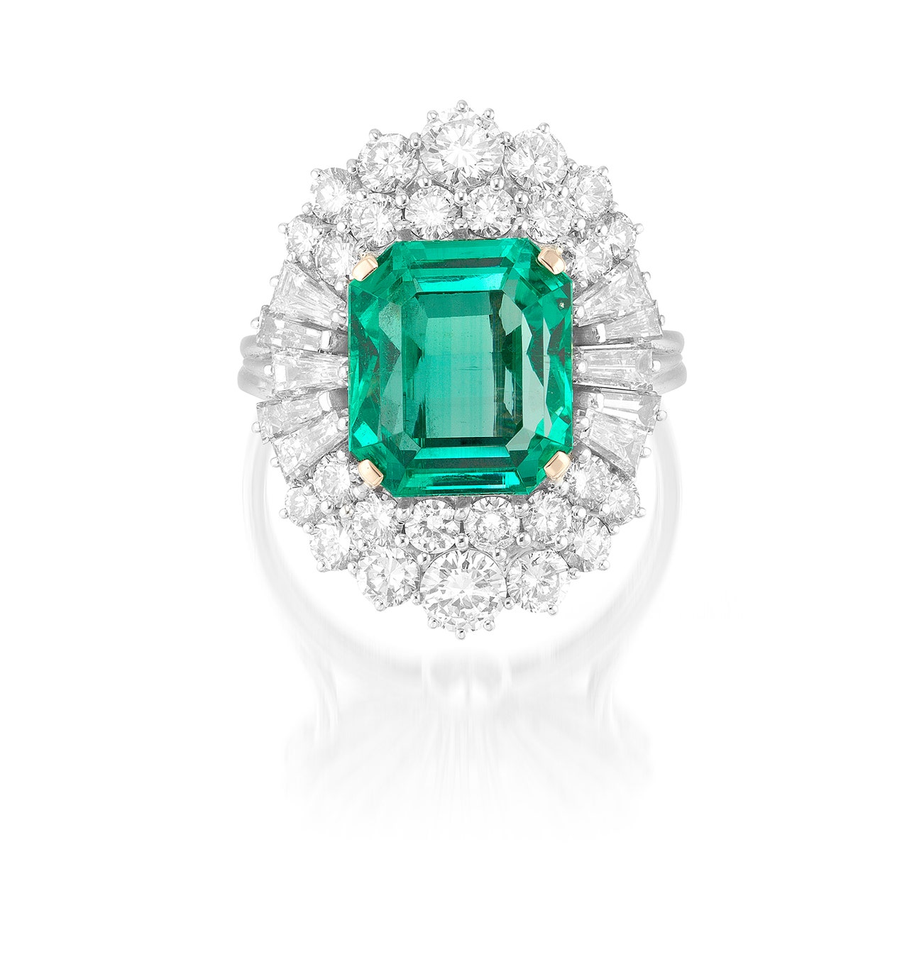Set with an octagonal step-cut emerald weighing approximately 5.54 carats, within brilliant-cut and tapered baguette diamonds surround, mounted in gold and white gold, size 7¾.
