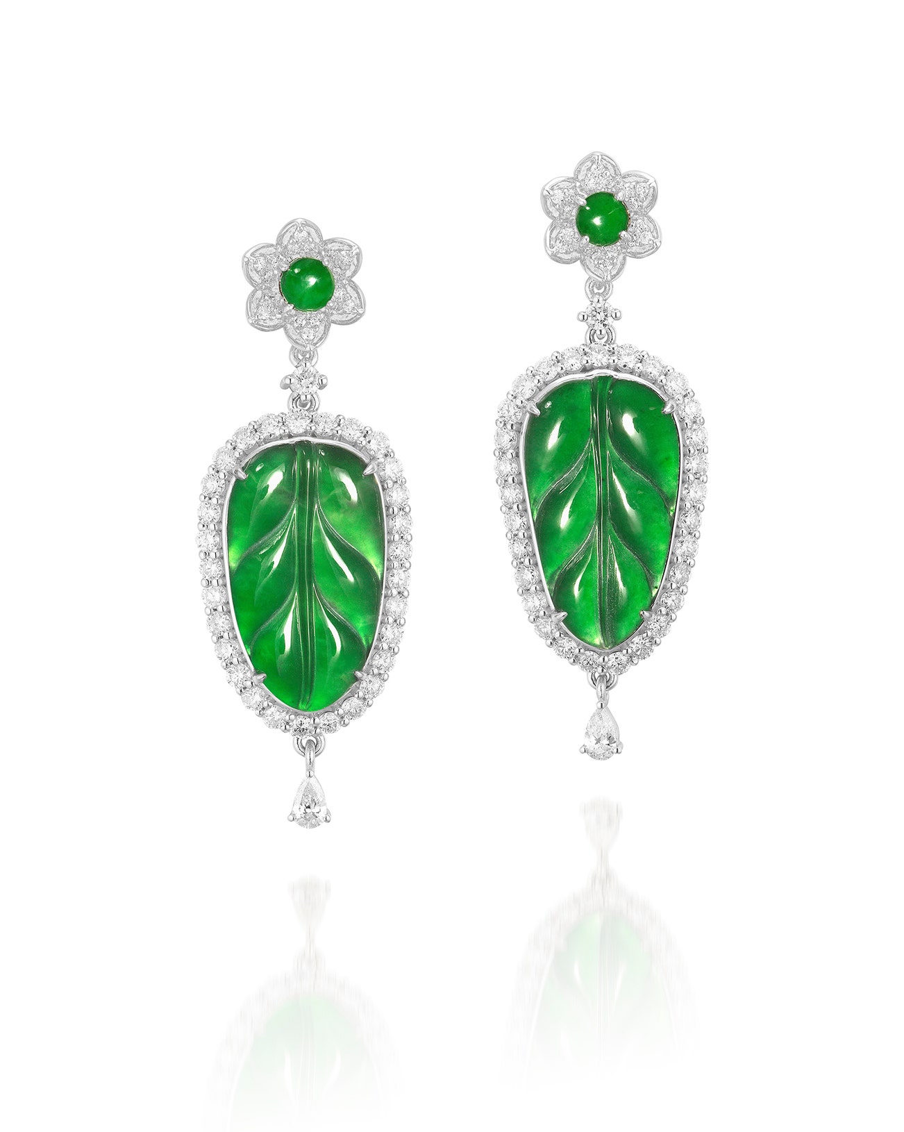 Each set with a carved jadeite leaf plaque of intense green colour, measuring approximately 19.98 x 11.67 x 1.91 mm and 20.63 x 11.71 x 1.92 mm respectively, within a brilliant-cut diamond surround, accented by a pear-shaped diamond, suspended from a surmount designed as a flowerhead, set at the center with a round jadeite cabochon, mounted in white gold, post and butterfly fittings, length approximately 45 mm.