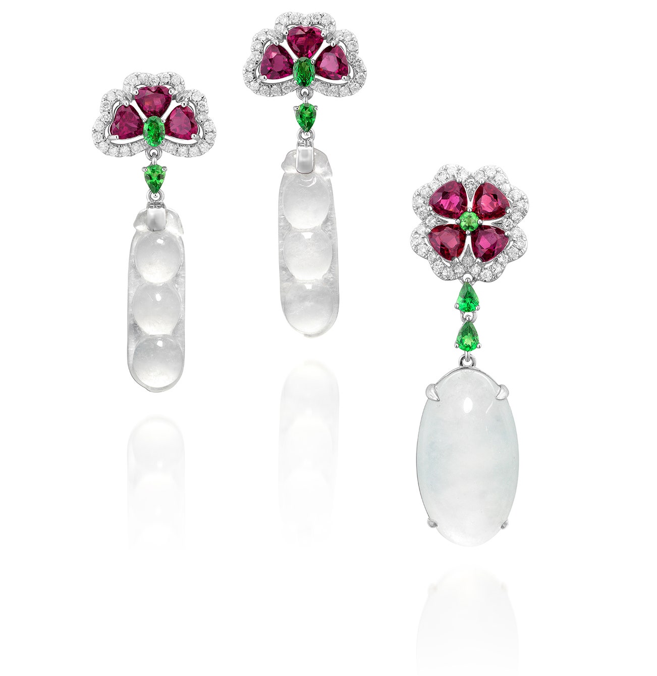 Comprising: a pendant suspending an oval icy jadeite cabochon of with good translucency, measuring approximately 23.20 x 13.23 x 8.01 mm, with a floral surmount set with a cabochon tsavorite garnet and heart-shaped almandine garnets, framed by brilliant-cut diamonds, connected by two pear-shaped tsavorite garnets; and a pair of ear pendants of similar design, each suspending an icy jadeite 'peapod' with very good translucency, measuring approximately 26.38 x 8.15 x 5.65 mm and 25.30 x 7.70 x 5.10 mm respectively, mounted in white gold, pendant length approximately 50 mm, earrings length approximately 45 mm.