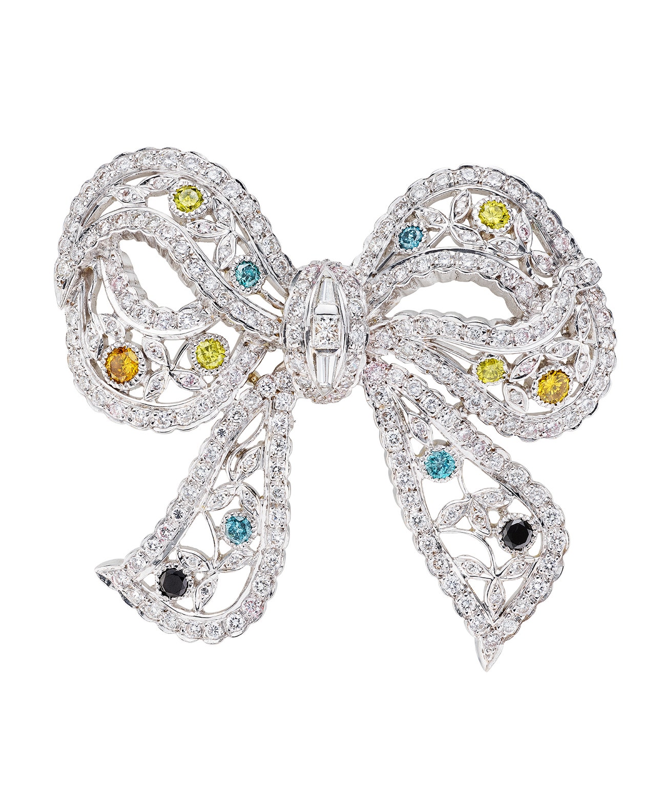 Designed as a bow, set with brilliant-cut diamonds of bluish green, greenish blue, yellow, and yellowish orange color tint, accented with near colorless brilliant-cut diamonds, mounted in 18K white gold.
