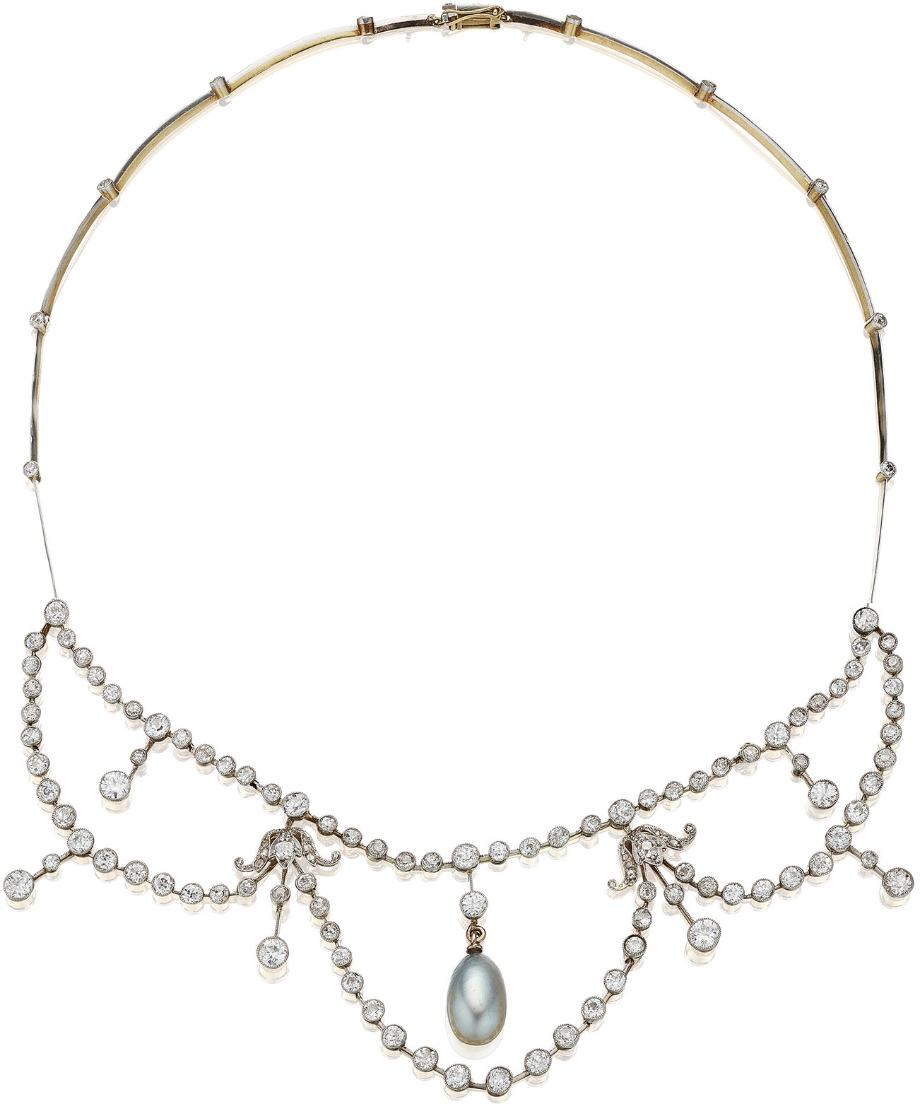Designed as circular-cut diamond swags, joined by knife-edge links, suspending circular-cut diamond drops and a central pearl drop measuring approximately 8.72 x 7.37 x 14.10 mm., with two old- and single-cut diamond-set foliate accents, mounted in platinum topped 14K gold, length approximately 16 3/4 inches.