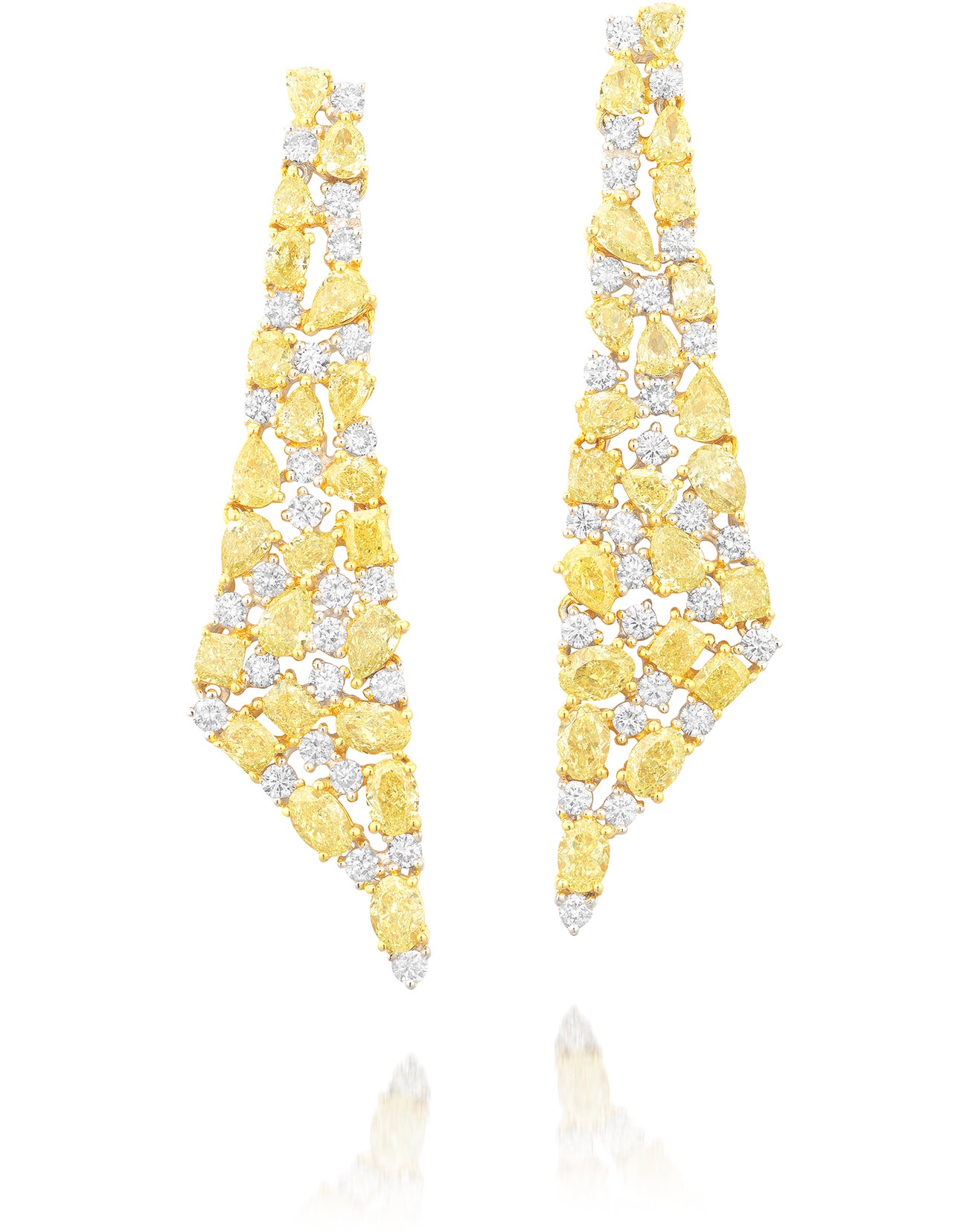 Each set with variously-cut diamonds of yellow tint, interspersed with brilliant-cut diamonds, mounted in white and yellow gold, post and butterfly fittings, length approximately 56 mm.