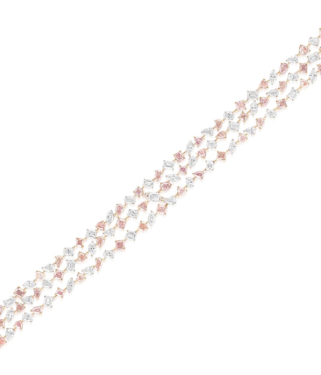 The triple-strand bracelet alternating set with variously cut diamonds and diamonds of pink tint, with a diamond-set clasp, mounted in pink and white gold, length approximately 180 mm.