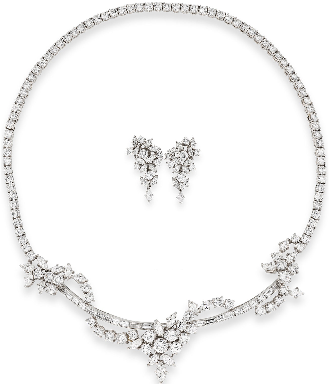 Comprising: a necklace set with marquise-shaped, brilliant-cut and baguette diamonds, central motif detachable and may be worn as a brooch, length approximately 410mm, one part detachable and may be worn as a bracelet, length approximately 170mm: and a pair of ear clips of cluster design, drops detachable.
