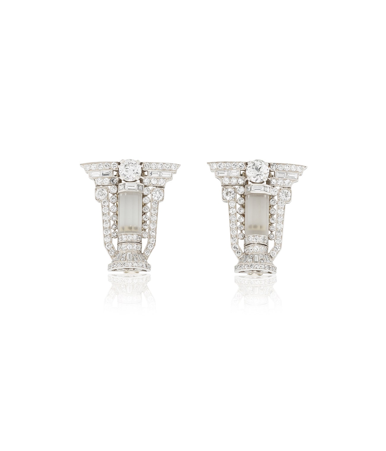 Designed as a stylised vase, set with polished rock crystal, circular-cut and baguette diamonds, the larger circular-cut diamonds weighing 0.92 and 1.04 carats respectively, each measuring approximately 32 x 28mm.
