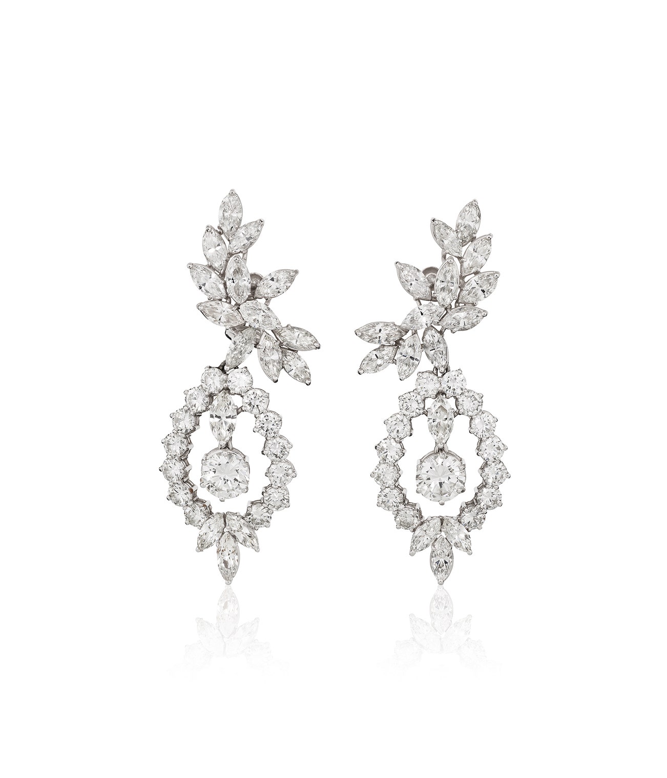 Each set with a central brilliant-cut diamond, weighing 1.95 carats and 2.00 carats respectively, accented with marquise-shaped and brilliant-cut diamonds, length approximately 70mm, French assay mark for platinum.