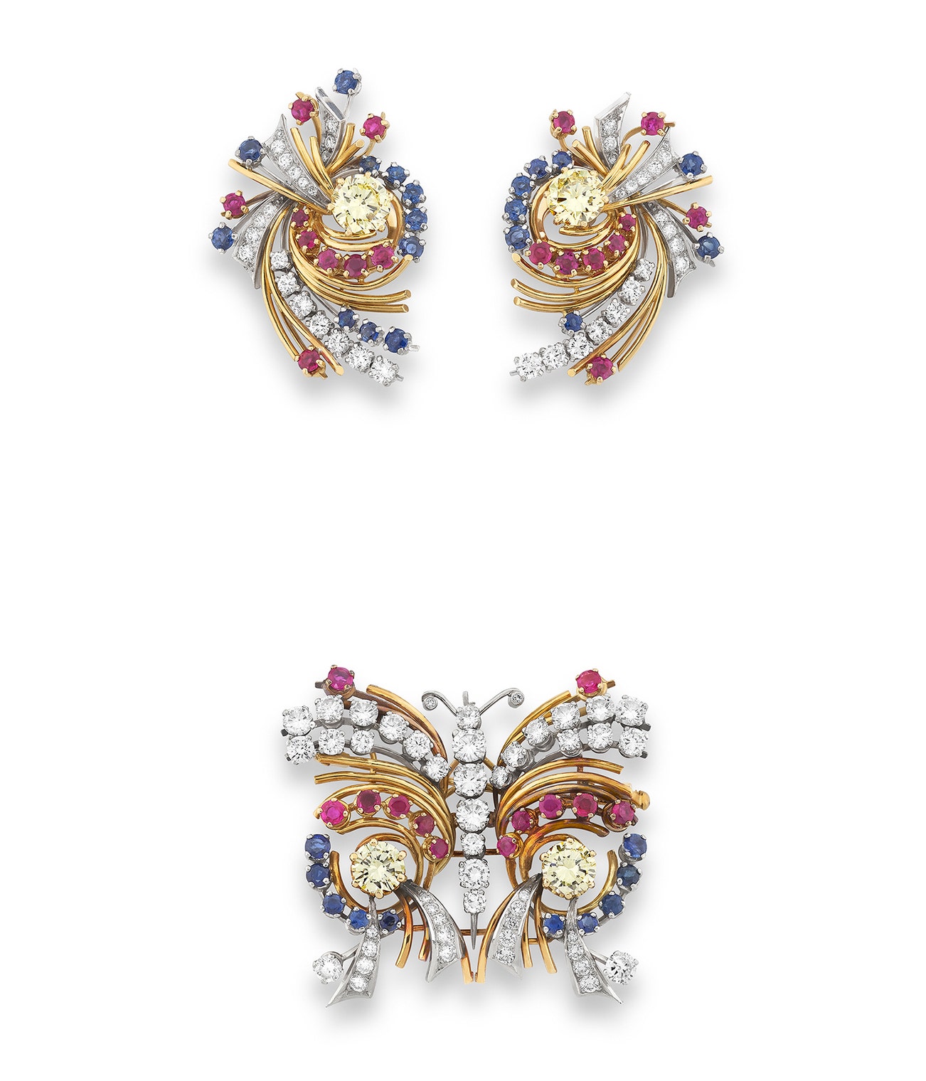 Comprising: a brooch, modelled as a butterfly, set with two brilliant-cut fancy yellow diamonds weighing 1.07 carats and 1.08 carats, accented with circular-cut rubies and sapphires and brilliant-cut diamonds, measuring approximately 42 x 45 x 6mm; together with a pair of ear clips, each set with a brilliant-cut fancy yellow diamond weighing 1.43 carats and 1.54 carats respectively, length approximately 40mm.