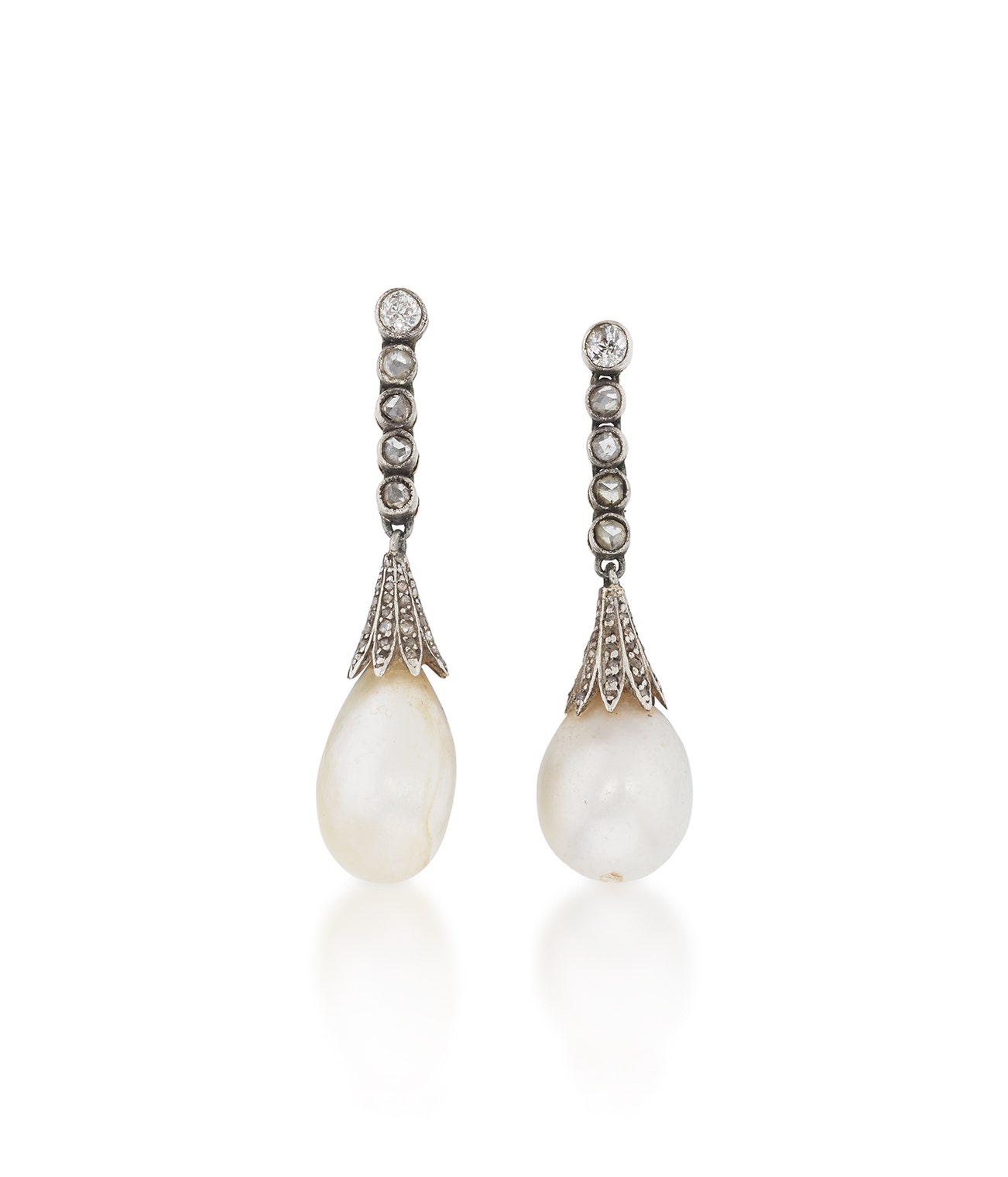 Pair of natural pearl and diamond earrings, circa 1910