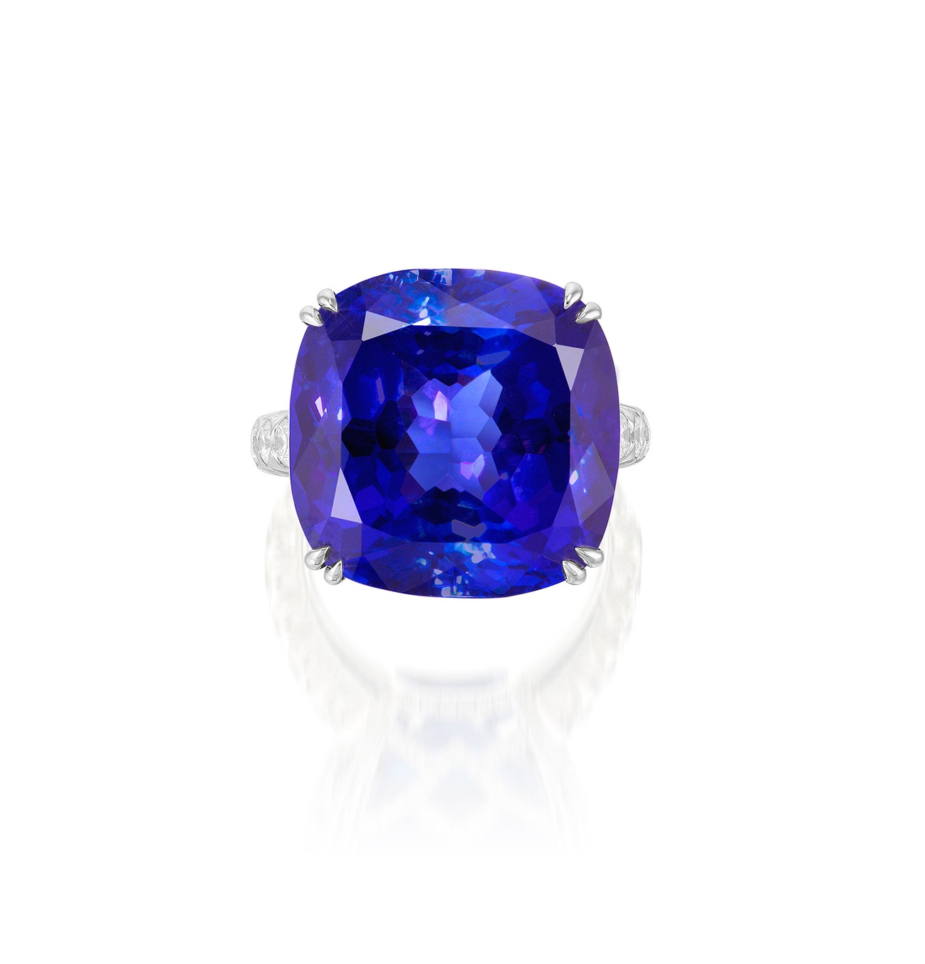 Set with a cushion-shaped tanzanite weighing approximately 32.88 carats, between brilliant-cut diamond shoulders, highlighted with diamond-set gallery, mounted in white gold, size 7½.