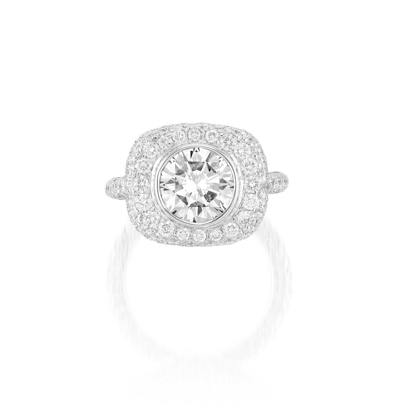 Bezel-set with a brilliant-cut diamond weighing approximately 2.38 carats, surrounded by pavé-set brilliant-cut diamonds, the ring band and gallery set throughout with similarly-cut diamonds, mounted in white gold, size 5½.
