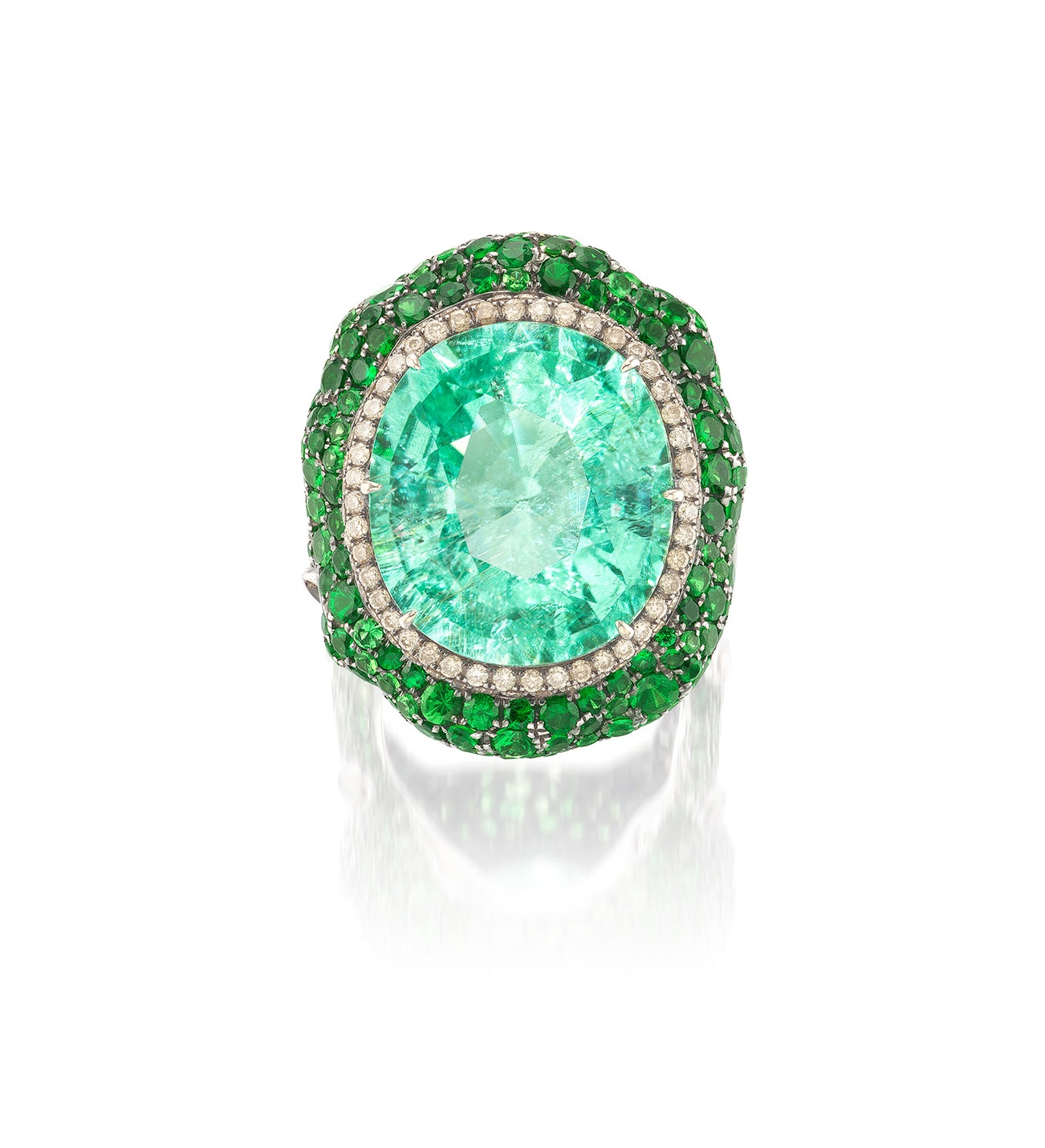 Set with an oval paraíba tourmaline weighing approximately 16.81 carats, within a double surround of circular-cut diamonds of brown tint, framed by circular-cut tsavorite garnets, the shoulders highlighted with diamond-set collets, mounted in white gold and blackened gold, size 6¼.