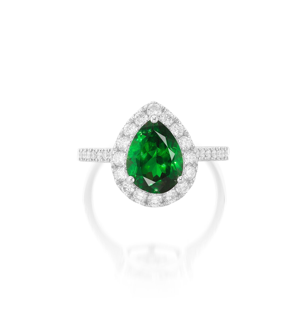 Set with a pear-shaped tsavorite garnet weighing approximately 2.16 carats, the surround and shoulders set with brilliant-cut diamonds, mounted in white gold, size 6¼.