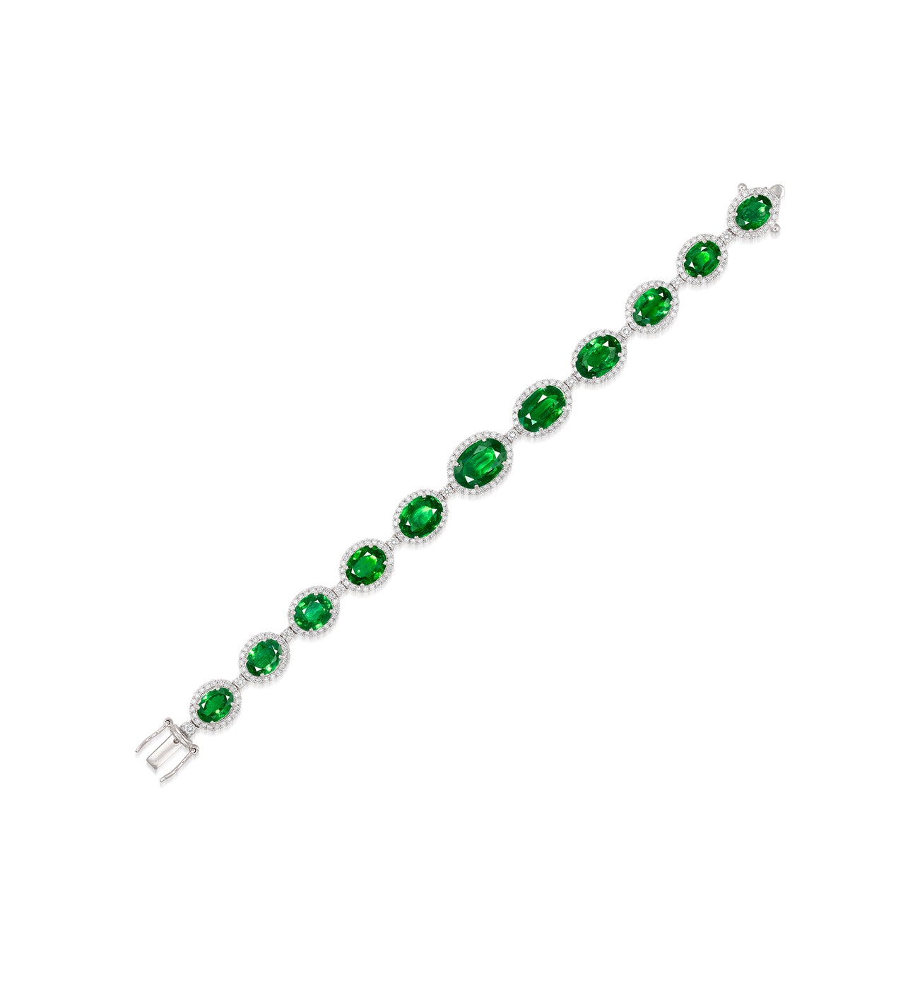 Set with eleven graduated oval tsavorite garnets together weighing approximately 22.53 carats, each within a brilliant-cut diamond surround, connected by a brilliant-cut diamond, mounted in white gold, length approximately 158 mm.
