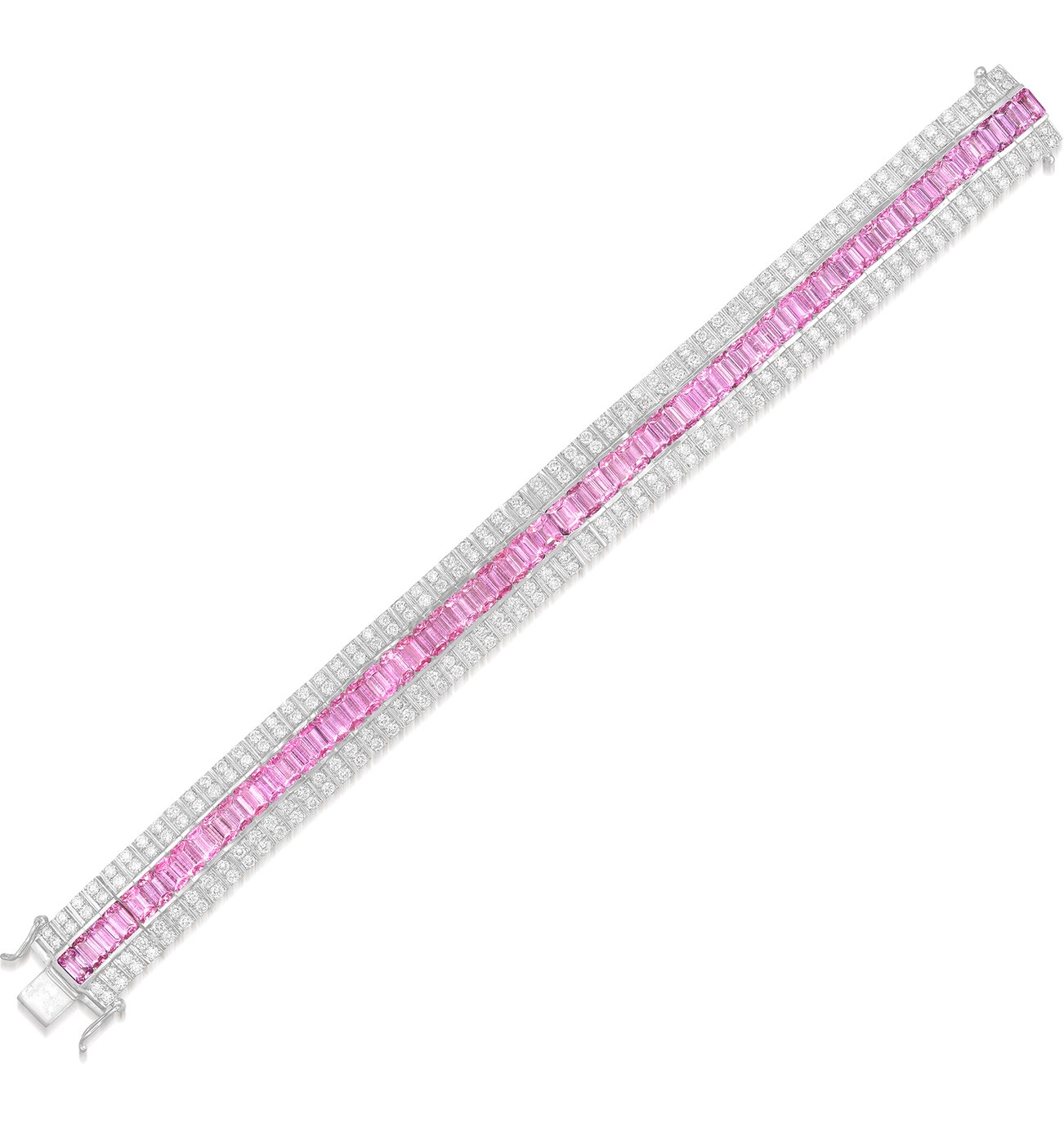 Set with a line of step-cut pink sapphires, between rows of brilliant-cut diamonds, mounted in white gold, length approximately 180 mm.