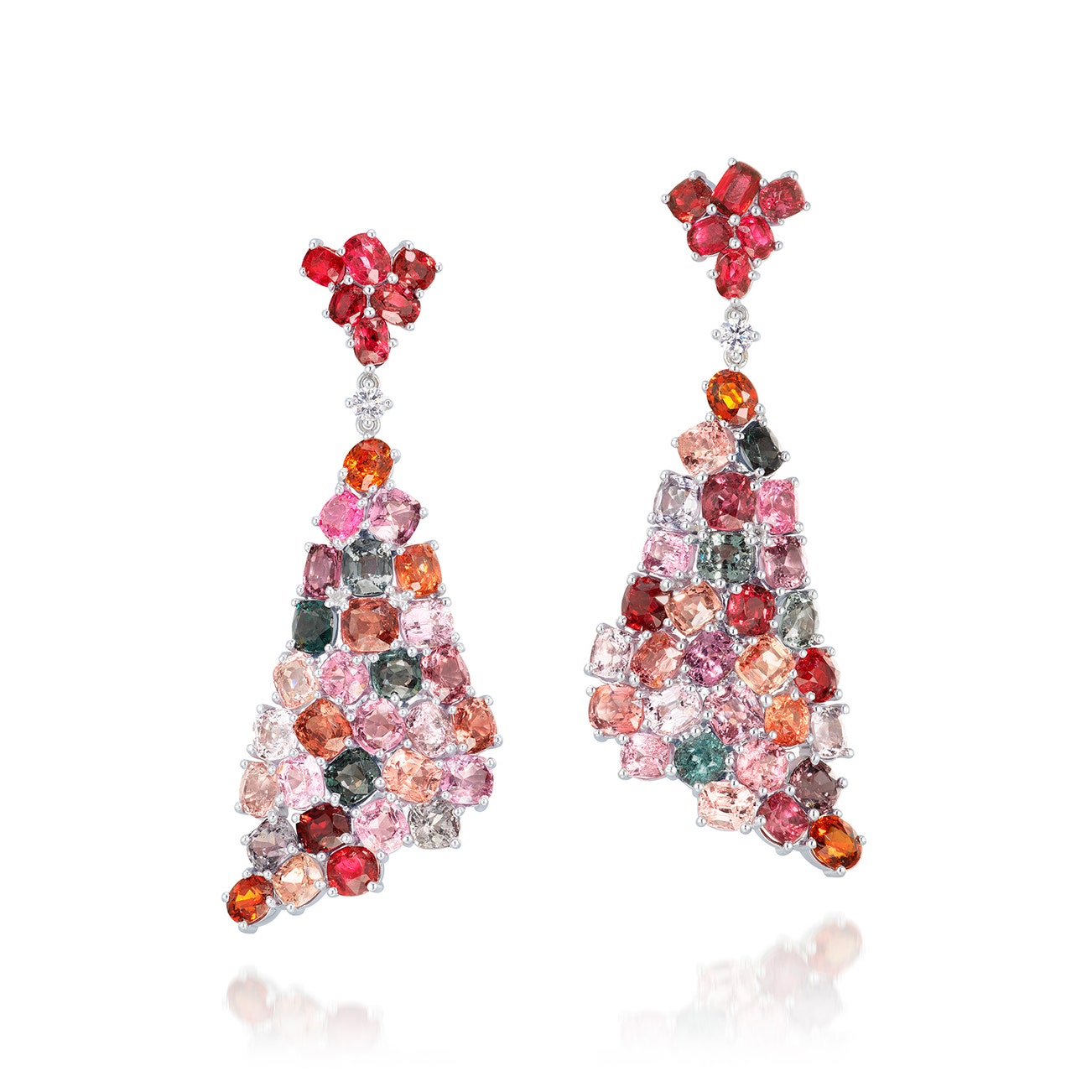 Each suspending a cluster of cushion-shaped and oval spinels of different hues, spaced by a brilliant-cut diamond, to the similarly set red spinel cluster top, post and butterfly fittings, length approximately 70 mm.