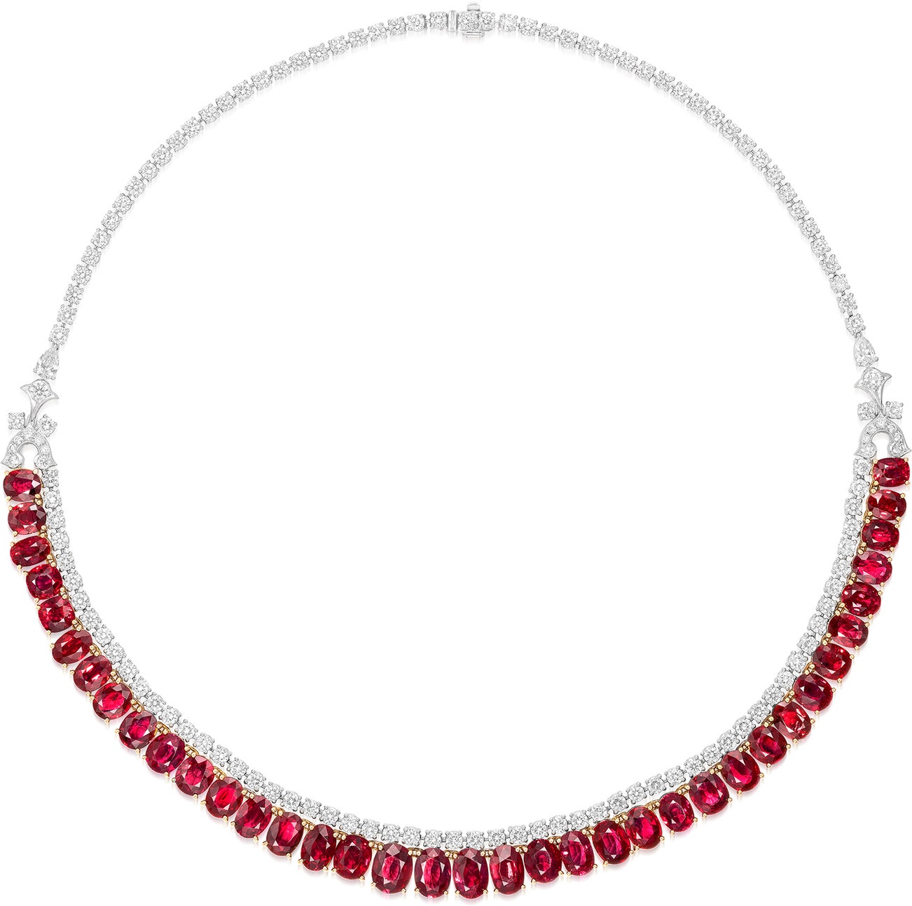 Set with thirty-seven graduated oval and cushion-shaped rubies weighing approximately 40.35 carats in total, suspending from a single line of brilliant-cut diamonds, decorated by motifs set with brilliant-cut and pear-shaped diamonds, mounted in white and yellow gold, length approximately 410 mm.