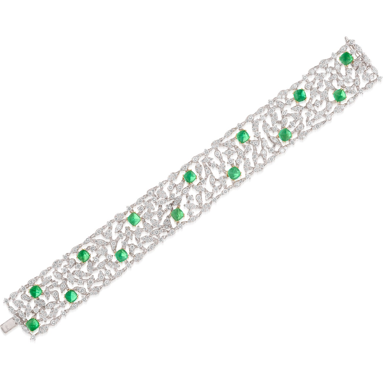 The supple openwork bracelet set with brilliant-cut diamonds, highlighted with sugarloaf emeralds, mounted in white and yellow gold, length approximately 180 mm respectively.