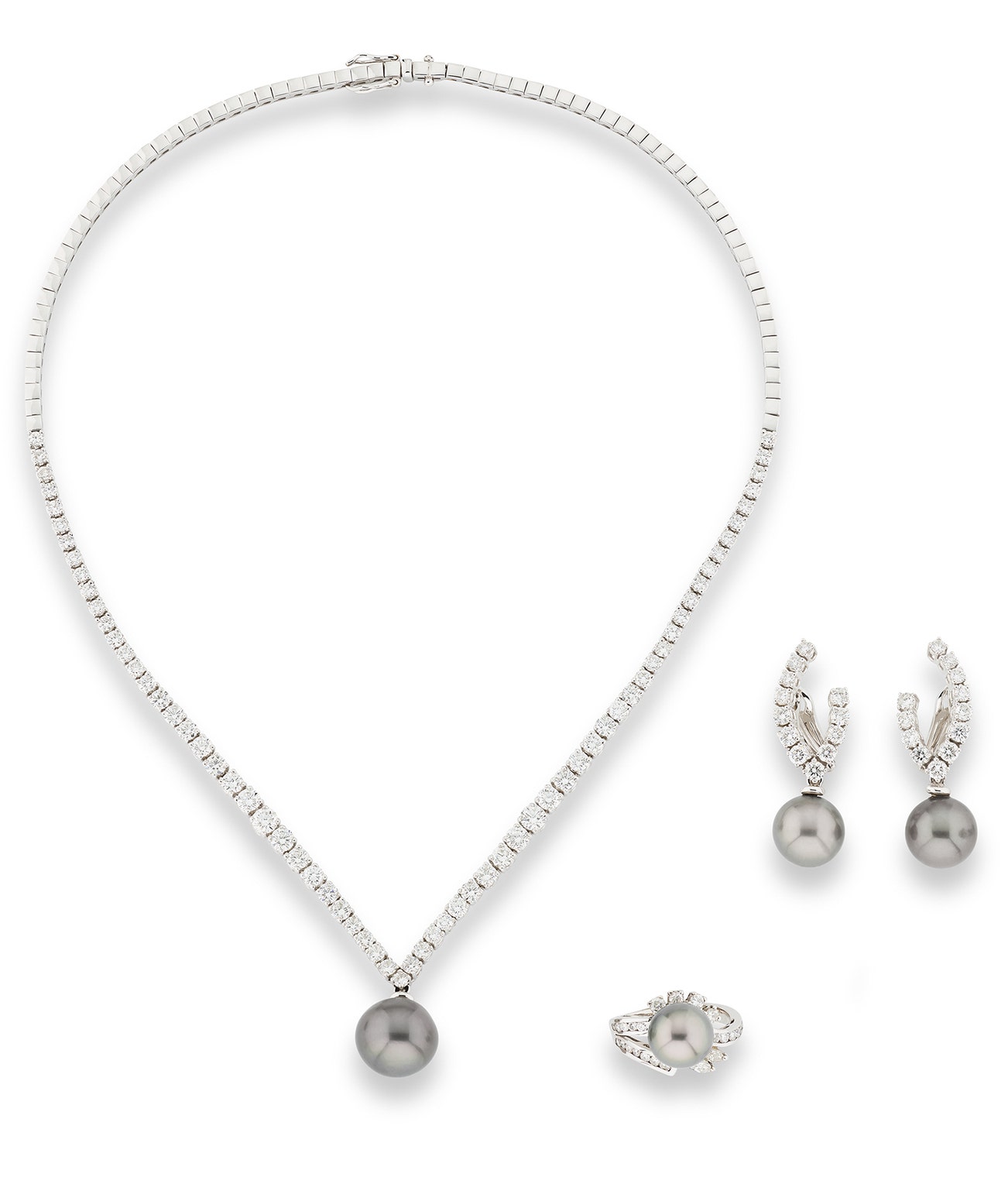 Comprising: a necklace, set with a button-shaped cultured pearl measuring approximately 12.47 x 12.87mm, highlighted with graduated circular-cut diamonds, length approximately 410mm, together with a pair of ear clips of similar design, the button-shaped cultured pearls measuring approximately 11.10 x 11.20mm and 11.13 x 11.16mm, length approximately 35mm, and a ring set with a cultured pearl measuring approximately 9.90-9.95mm, accented with marquise-shaped and circular-cut diamonds, size 50.