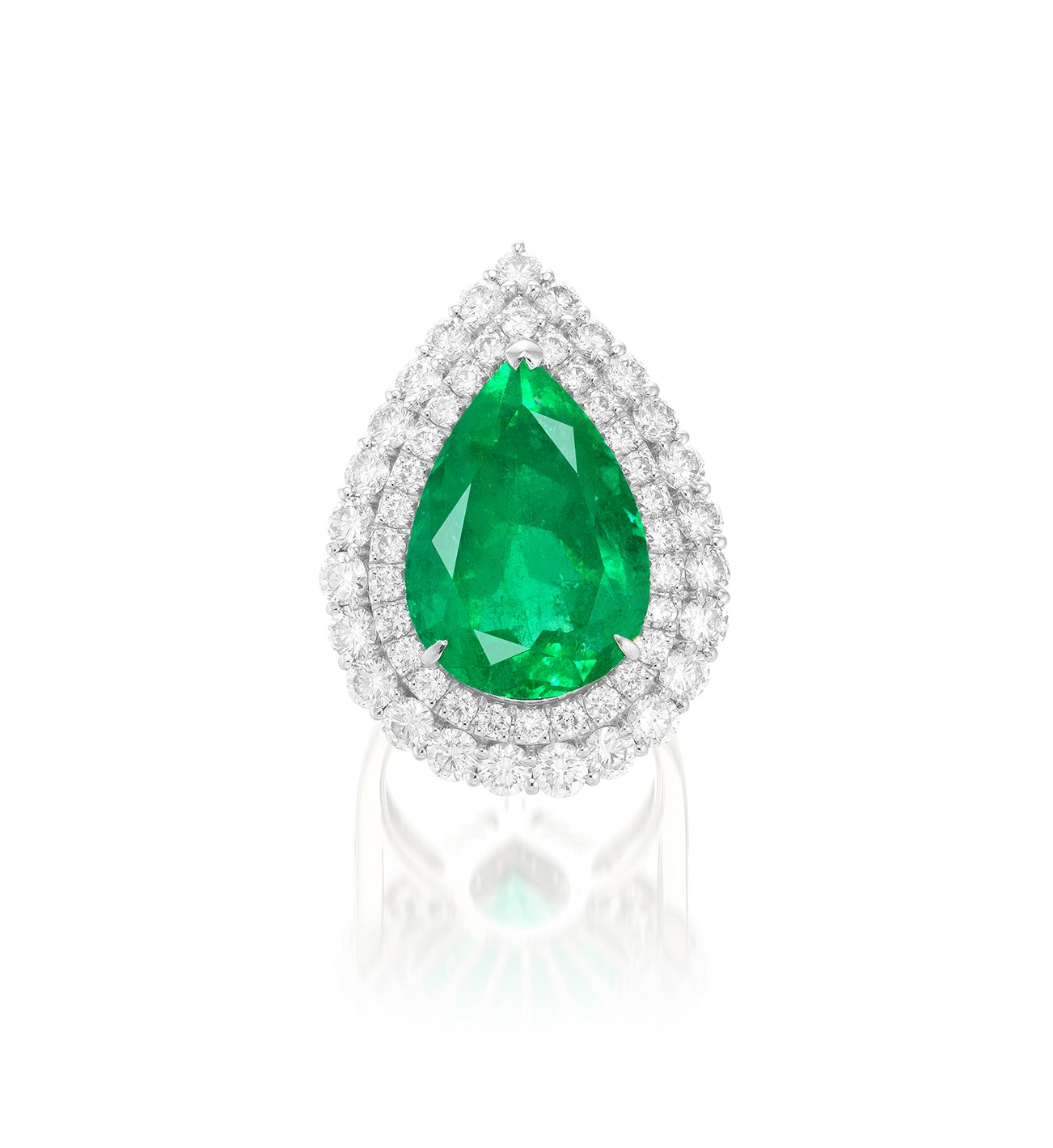 Set with a pear-shaped emerald weighing approximately 14.83 carats, within a two-tiered brilliant-cut diamond frame, between diamond-set shoulders, mounted in platinum, size 6½.