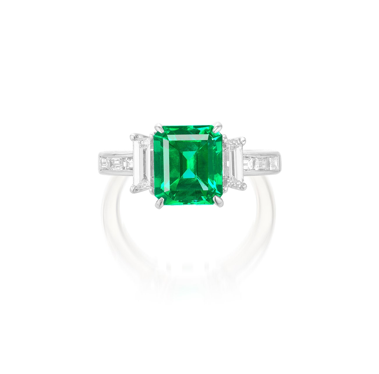 Accompanied by Gübelin report no.22111018, stating that the emerald is of Colombian origin, with no indications of clarity enhancement. Also accompanied by two GIA reports no. 7363882519 and 2366882522, stating that the two baguette diamonds are E and F Colour, both VS2 Clarity; together with a gemmological report.