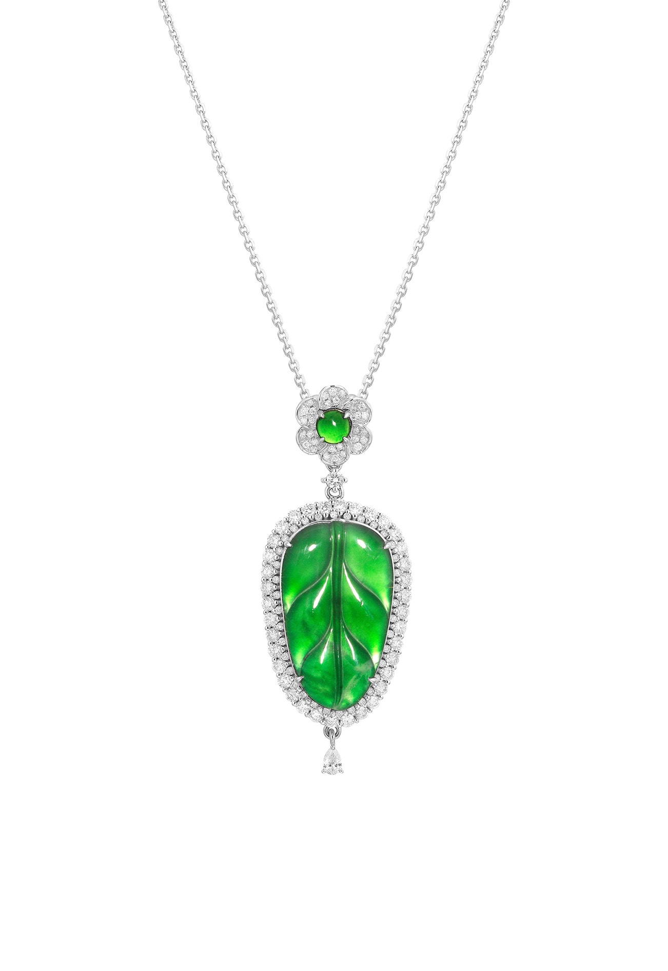 Set with a carved jadeite leaf plaque of intense green colour with good translucency, measuring approximately 25.45 x 14.82 x 1.80 mm, within a brilliant-cut diamond surround, accented by a pear-shaped diamond, suspended from a surmount designed as a flowerhead, set at the center with a round jadeite cabochon with diamond-set petals, joined by a brilliant-cut diamond, with a fine link chain, mounted in white gold, pendant length approximately 52 mm, link chain length approximately 450 mm.