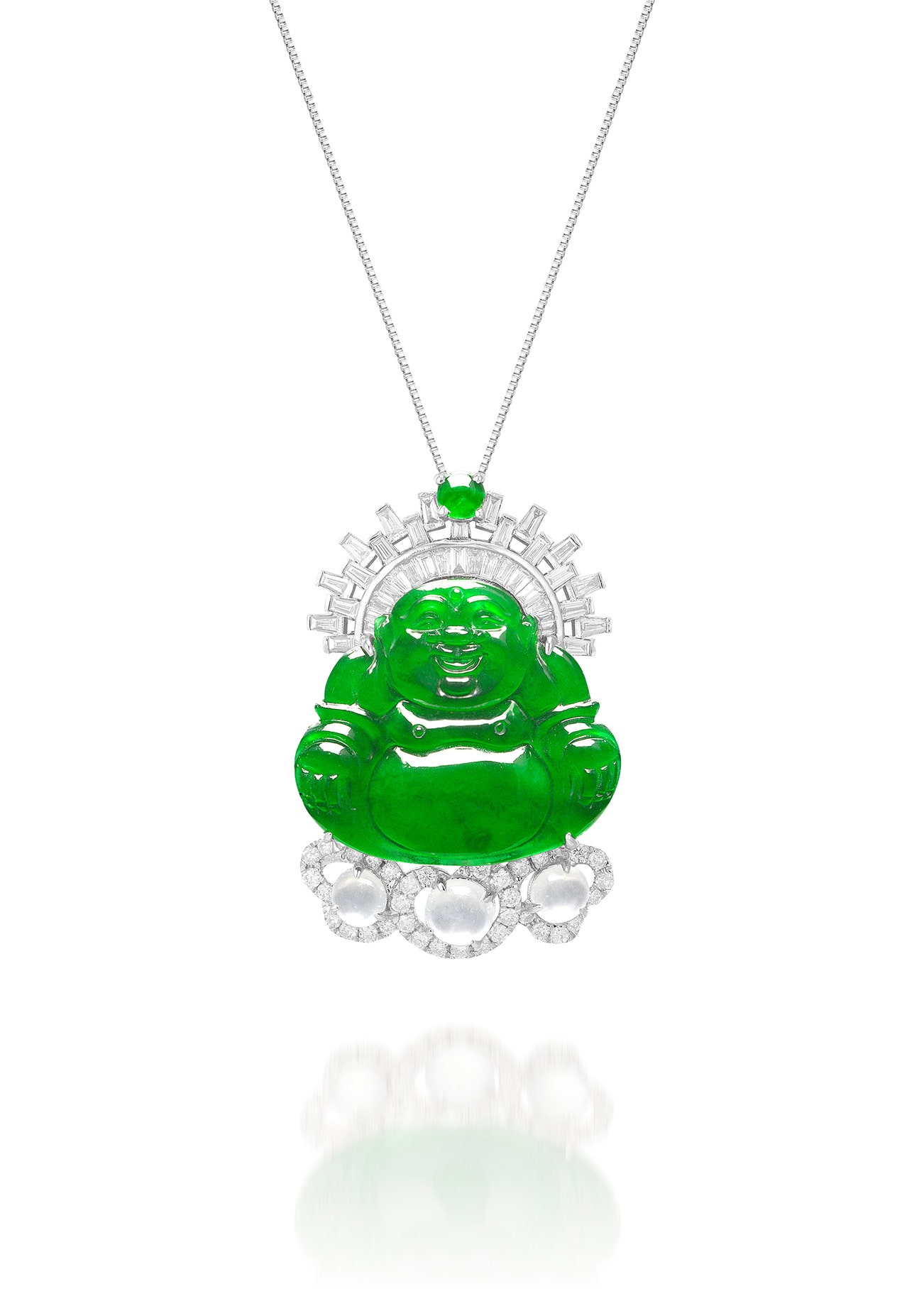 Set with a carved jadeite buddha of intense green colour with good translucency, measuring approximately 19.89 x 22.38 x 2.23 mm, decorated by three colourless jadeite cabochons, embellished with a round cabochon jadeite of green colour, brilliant-cut and baguette diamonds, accompanied by a fine link chain, mounted in white gold, pendant length approximately 33 mm.