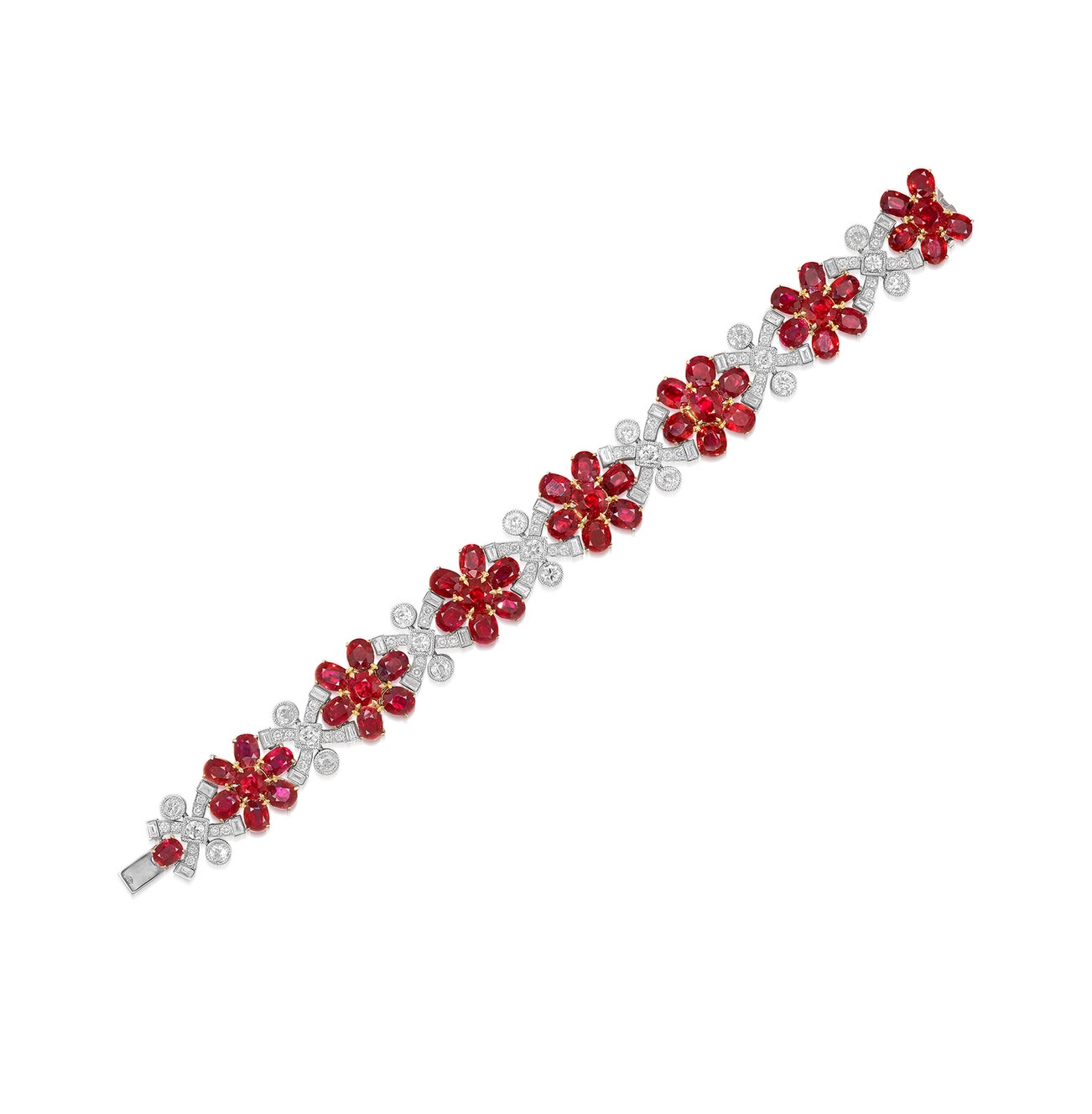 Composed of a series of flowerheads set with oval and circular-cut rubies, alternating with brilliant-cut and baguette diamond motifs, mounted in white and yellow gold, length approximately 173mm.