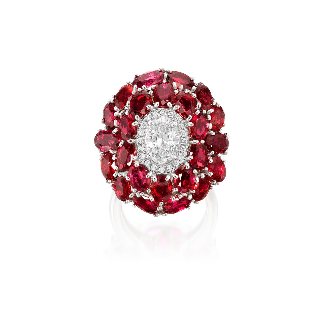 Set with an oval diamond, surrounded by brilliant-cut diamonds, within two-tiered frame set with oval rubies, mounted in platinum, size 5¾.