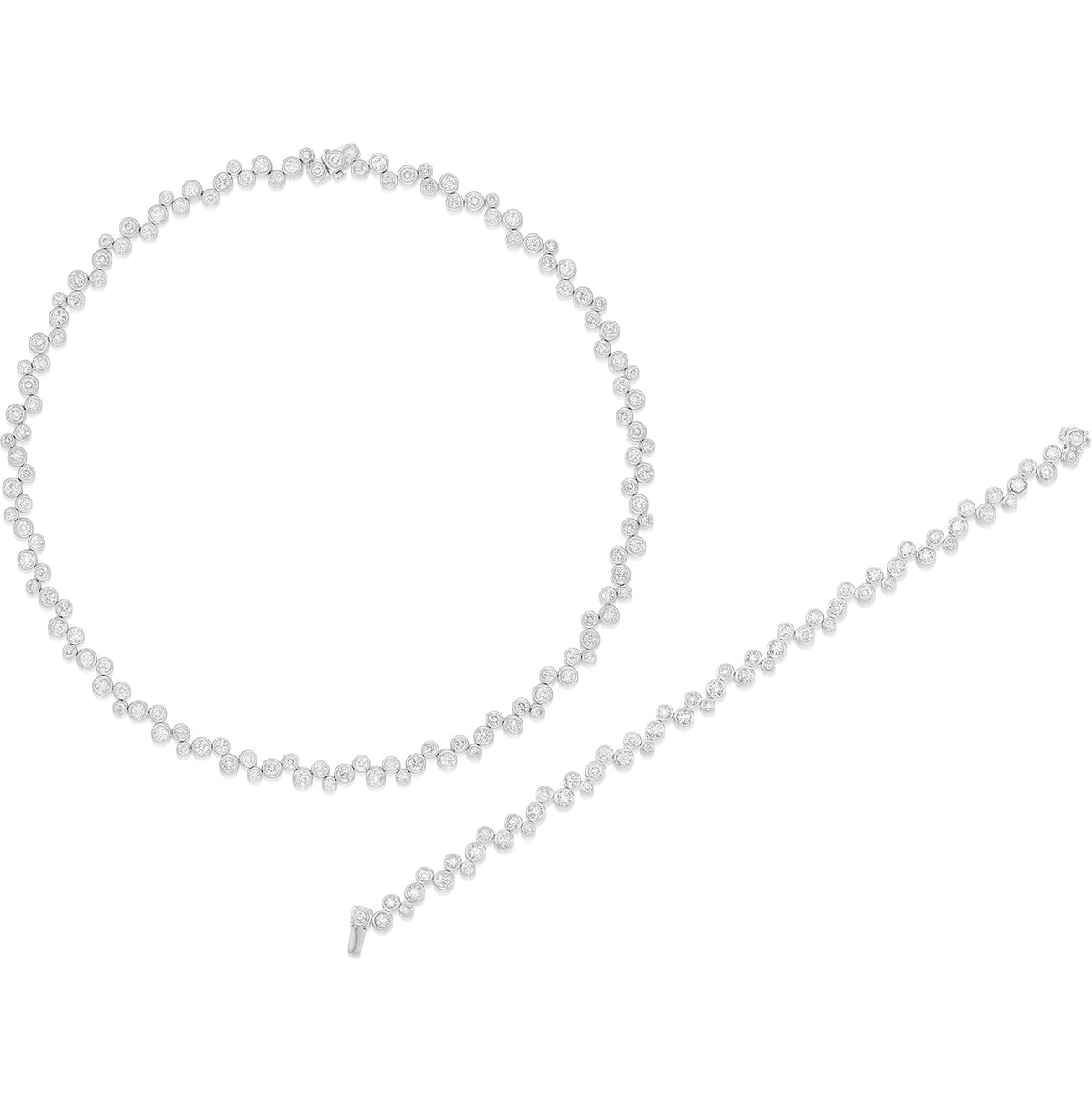 Comprising: a necklace set with brilliant-cut diamond collets; and a bracelet of similar design, mounted in white gold, necklace and bracelet lengths approximately 415 mm and 185 mm respectively.