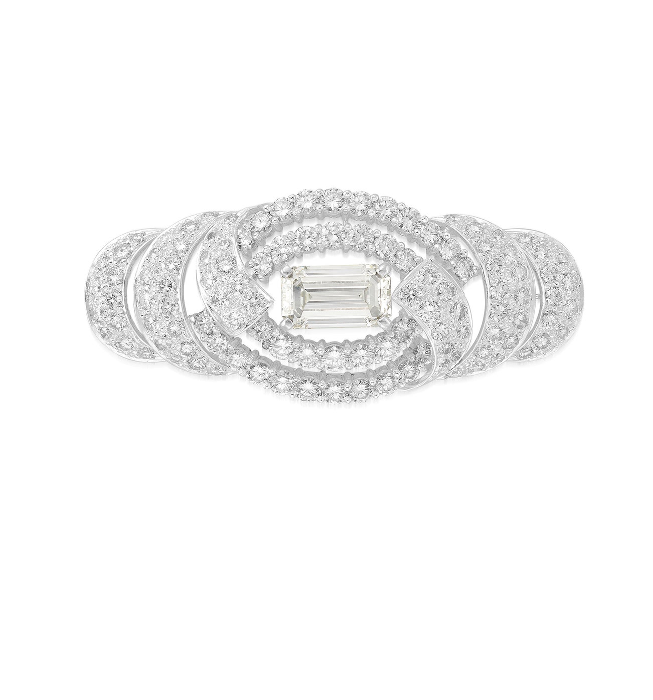 Of ribbon scroll design, set with an emerald-cut diamond weighing 5.60 carats, decorated with brilliant-cut diamonds, mounted in white gold, width approximately 65 mm.