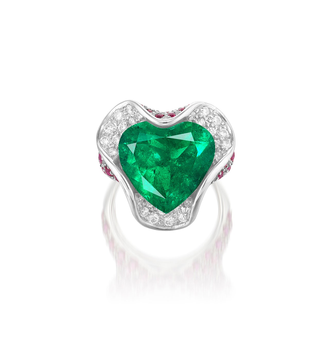Set with a heart-shaped emerald weighing approximately 6.55 carats, accented by pavé-set brilliant-cut diamonds and circular-cut rubies, mounted in white gold, size 5¼.