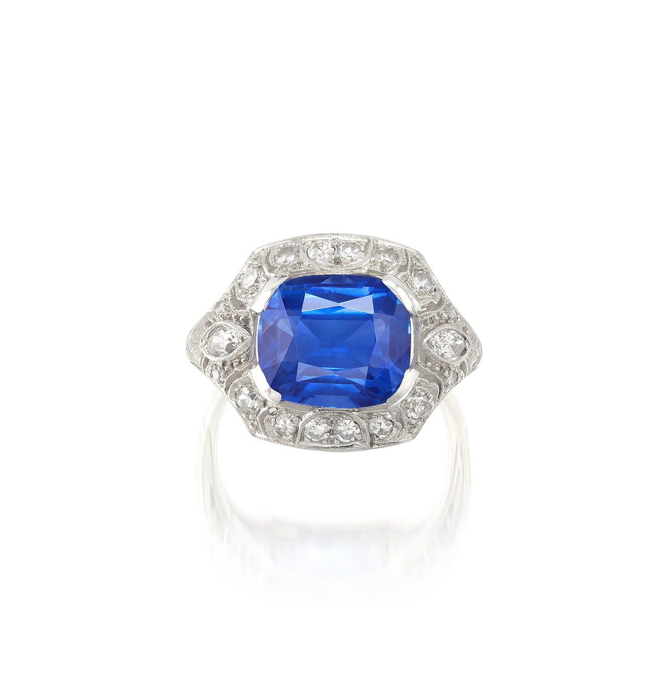Set with a cushion-shaped sapphire weighing 5.39 carats, surrounded by single-cut and oval diamonds, mounted in platinum, size 5¼.