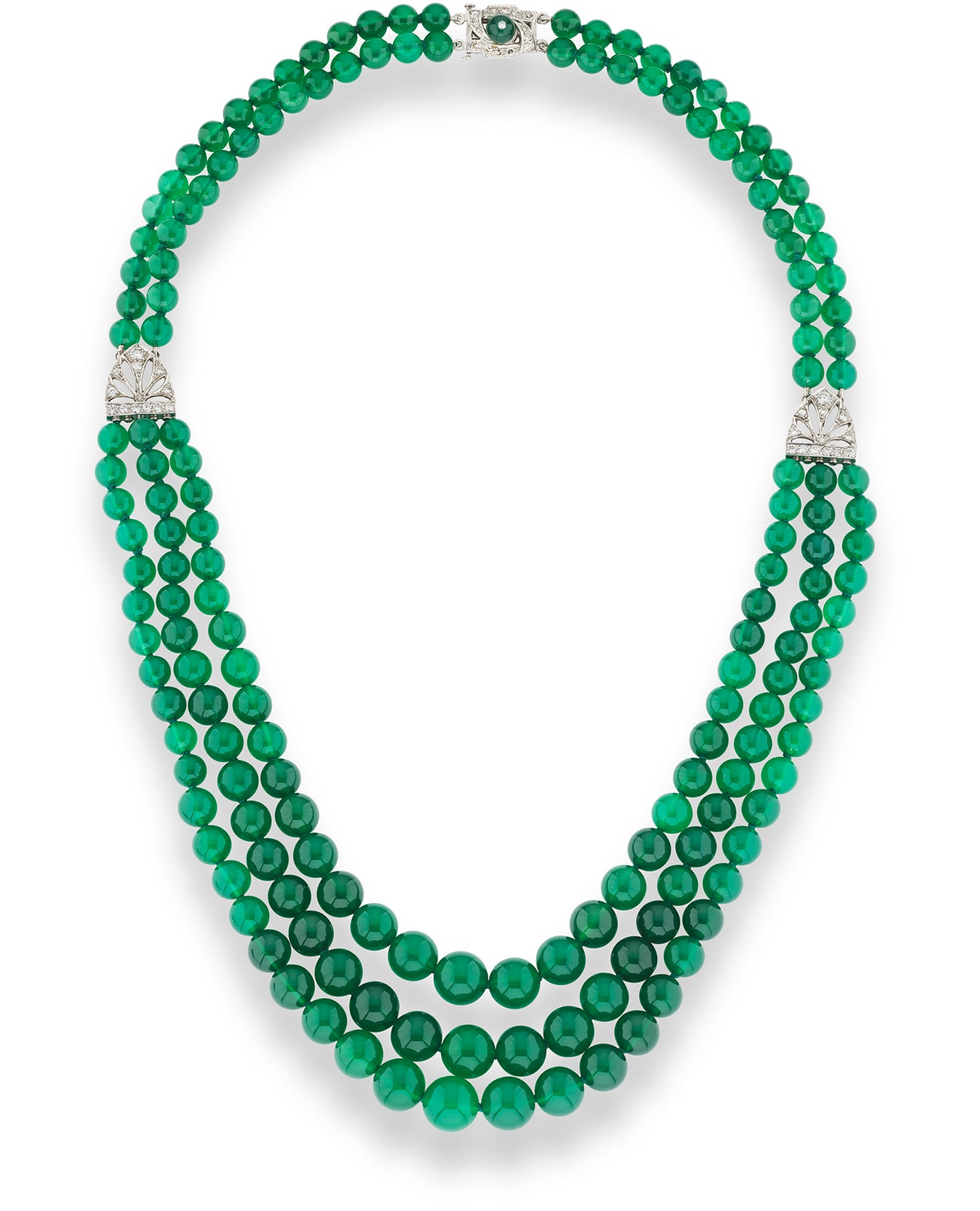 Composed of three rows of graduated chrysoprase beads, highlighted with circular-cut diamonds,