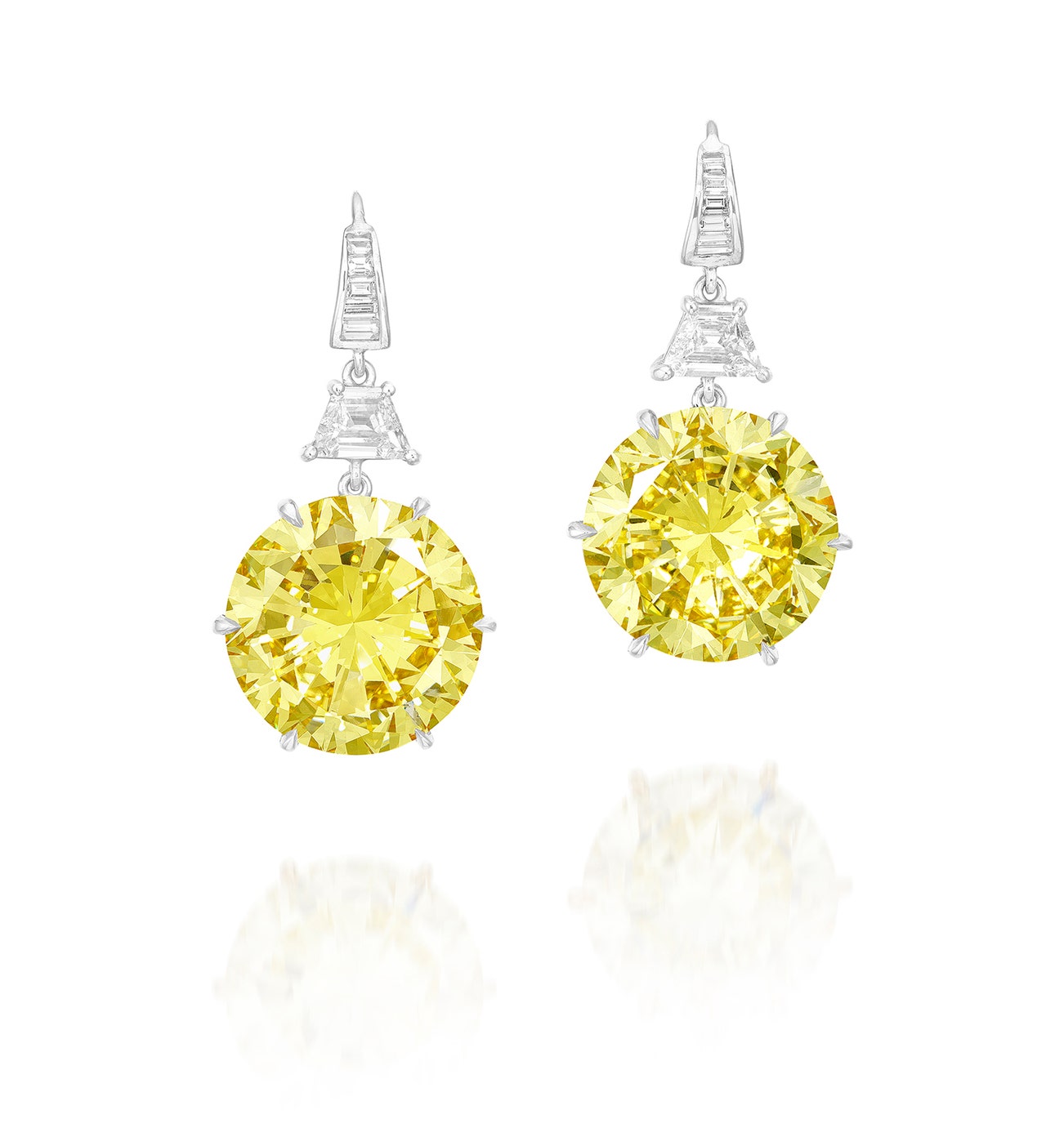 This pair of elegant ear pendants is mounted with not just one, but two round brilliant-cut Fancy Intense Yellow diamonds. A single round brilliant-cut Fancy Intense Yellow diamond close to 10 carats is an extraordinary find, to gather two of such rare materials in matching colour grade, clarity, size, face-up brilliance, and fire is yet another epitome of rarity.
