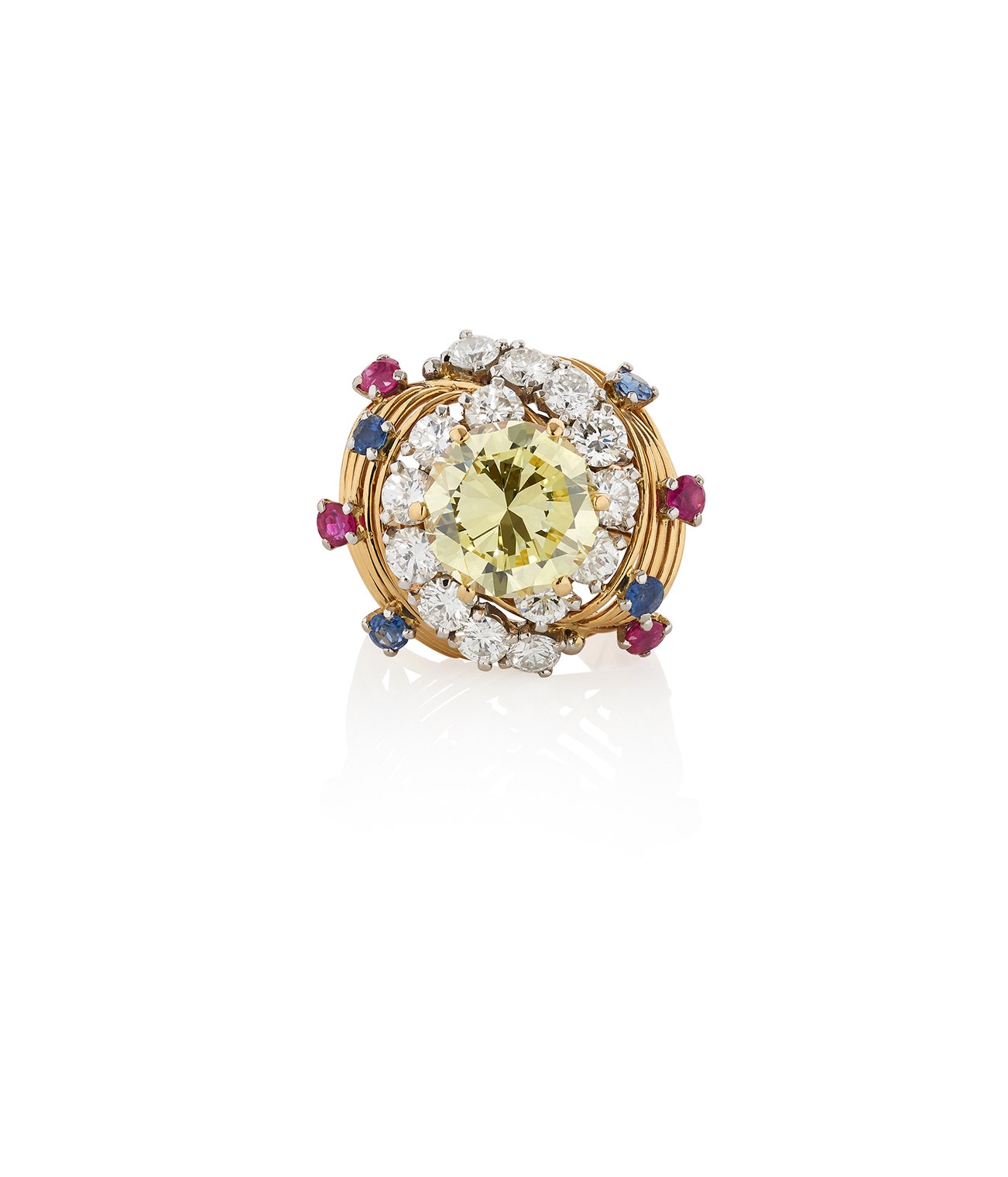 Set with a brilliant-cut fancy intense yellow diamond weighing 4.54 carats, accented with circular-cut sapphires, rubies and brilliant-cut diamonds, size 45.