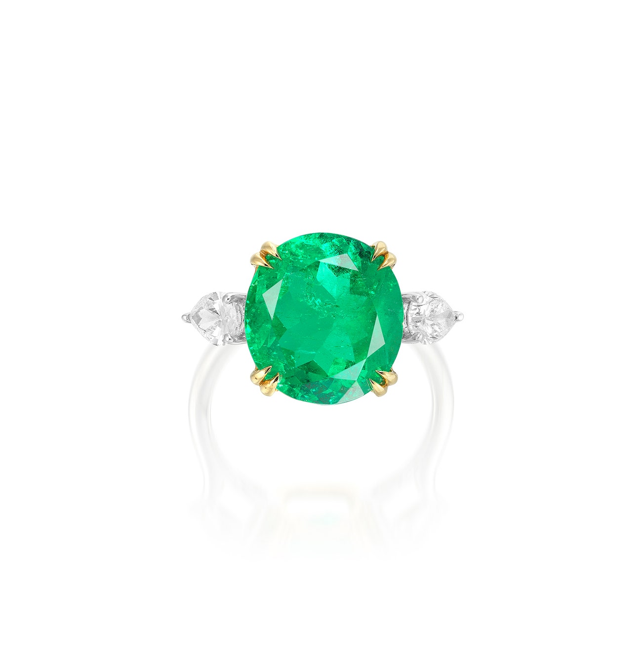 Set with an oval emerald weighing approximately 5.51 carats, flanked by two pear-shaped diamonds, mounted in platinum and yellow gold, size 5¾.