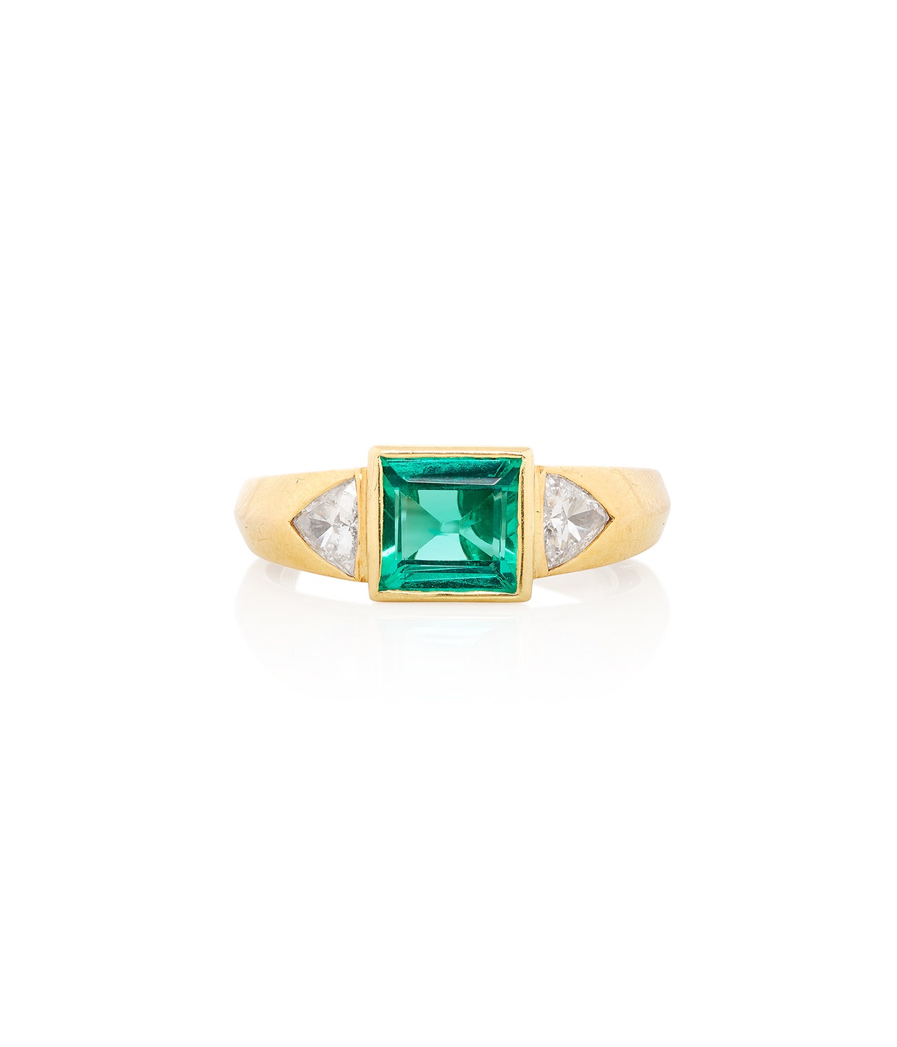 Set with a step-cut emerald, accented with two shield-shaped diamonds,