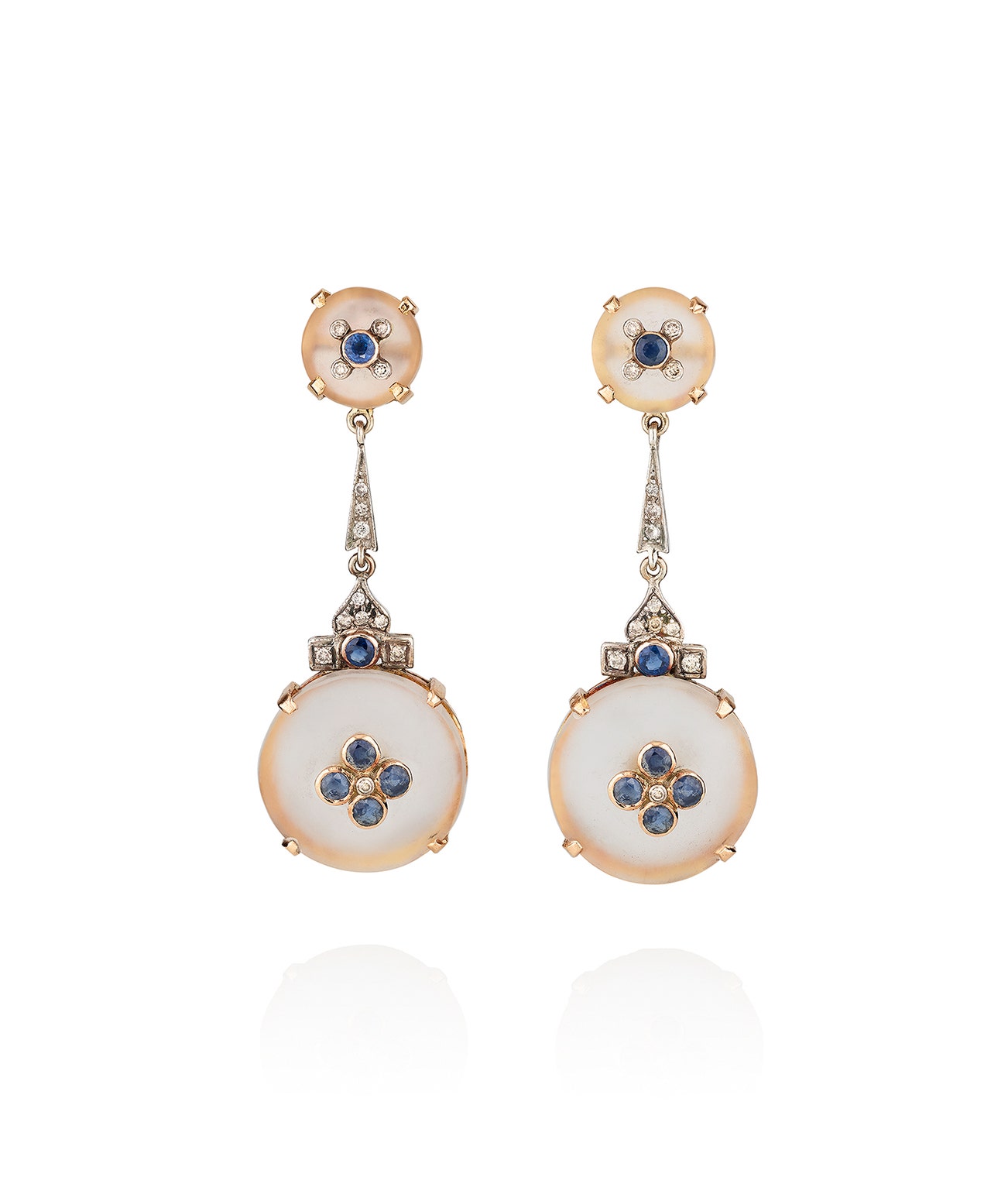 Each composed of rock crystal discs, set with circular-cut sapphires and diamonds, length approximately 55mm.
