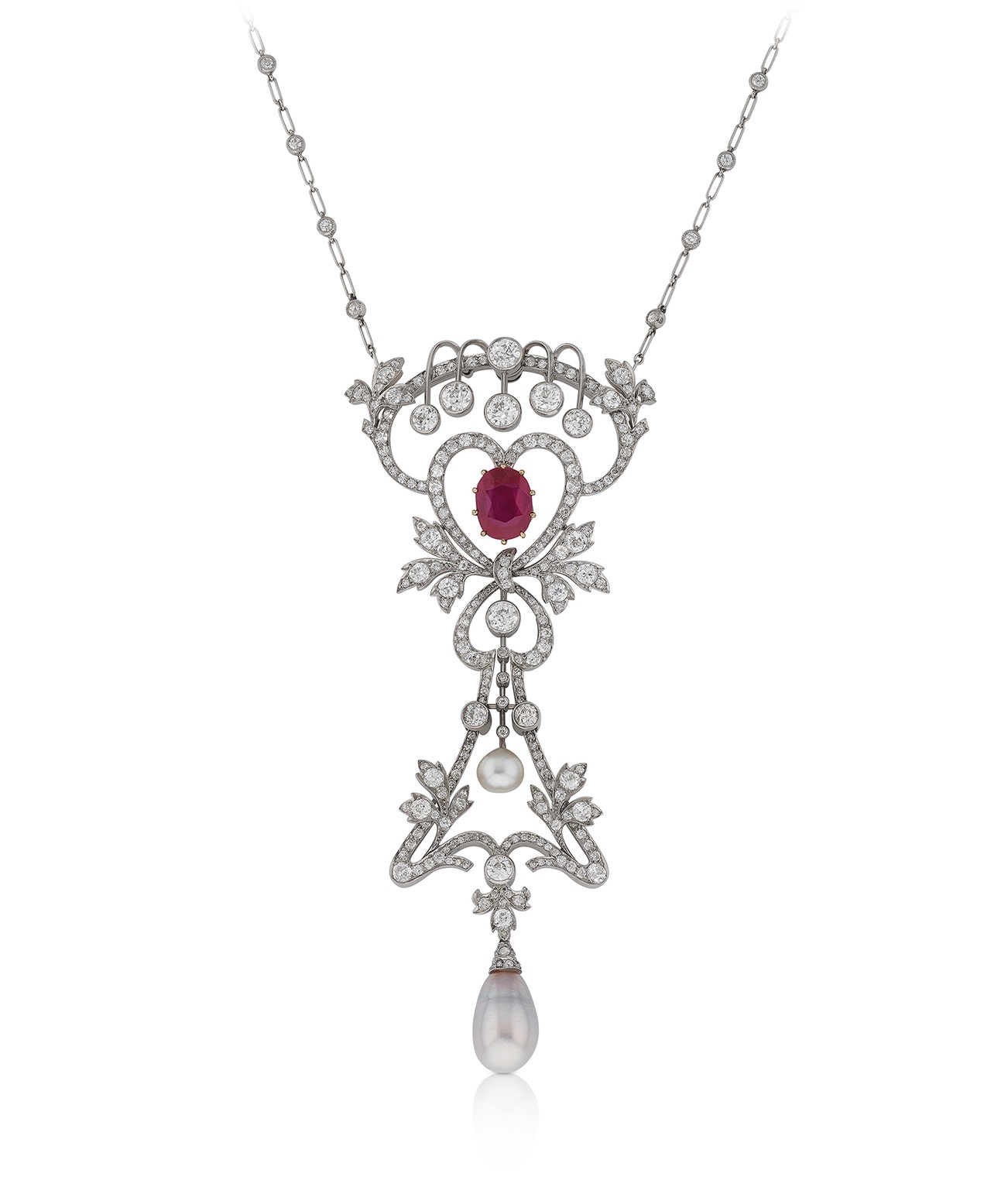 Of openwork design, the pendant set with an oval ruby weighing 4.12 carats, accented with circular-cut diamonds and a button-shaped natural pearl measuring approximately 6.50-6.85 x 6.70mm, suspending a drop-shaped natural pearl measuring approximately 8.95-9.40 x 14.90mm, the chain with spectacle-set circular-cut diamonds, length measuring approximately 380mm, pendant length approximately 105mm, a few small diamonds deficient.