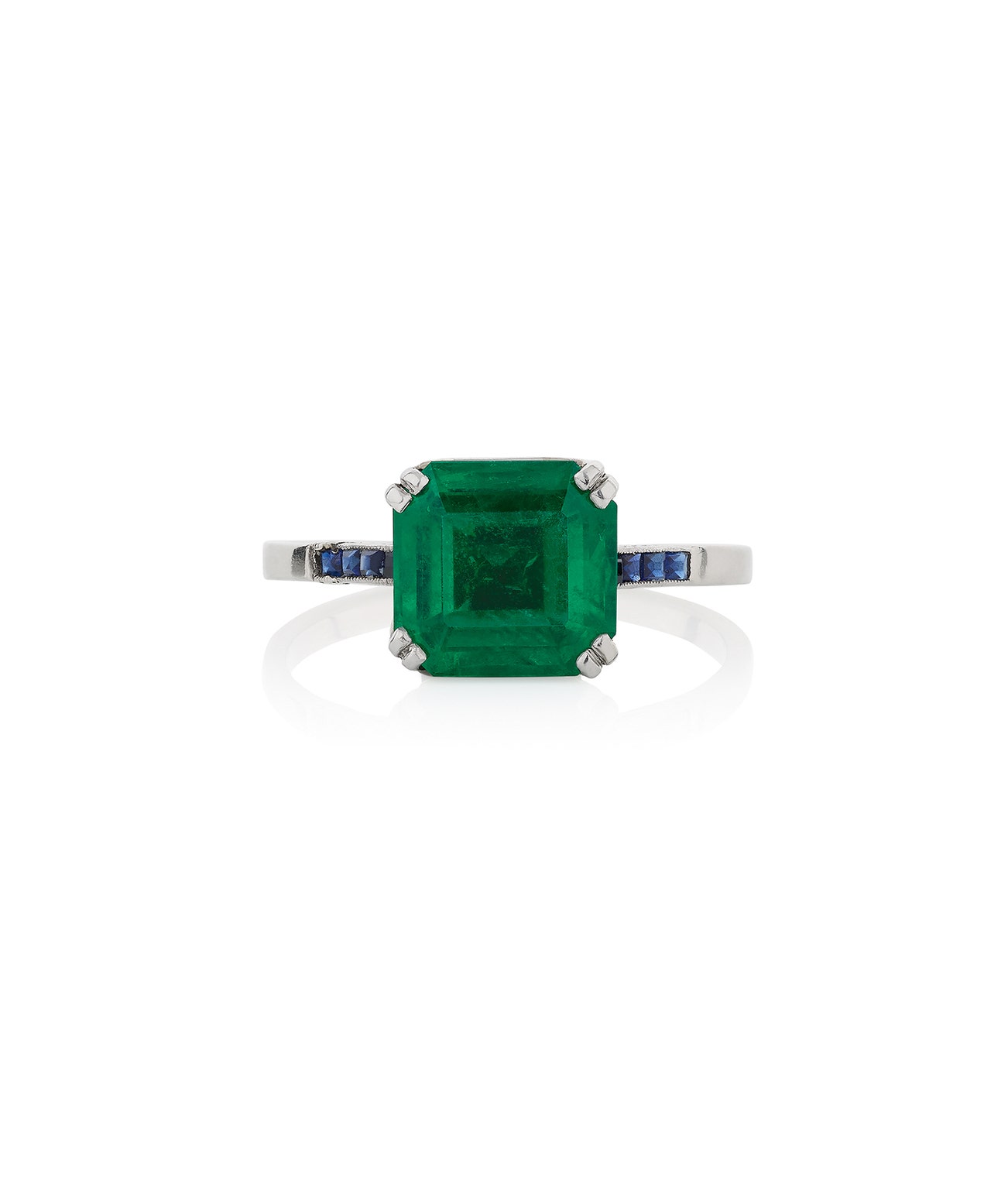 Set with an octagonal step-cut emerald stated to weigh 3.08 carats, accented with calibré-cut synthetic sapphires, size 59.