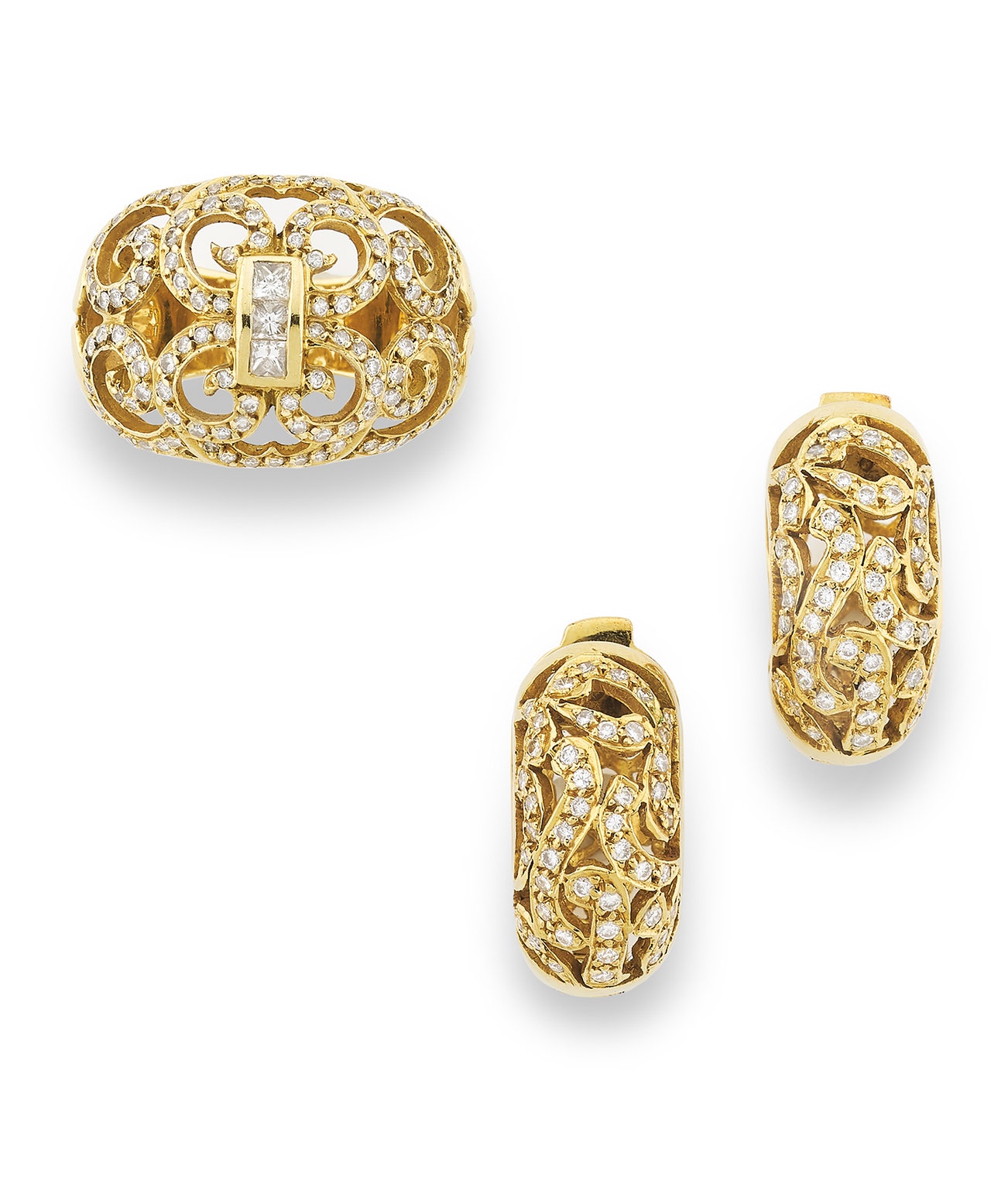 Comprising: a ring and a pair of earrings, of openwork design, the ring set with princess-cut diamonds, highlighted with brilliant-cut diamonds, size 54, maker's mark, the earrings set with brilliant-cut diamonds, length approximately 20mm.