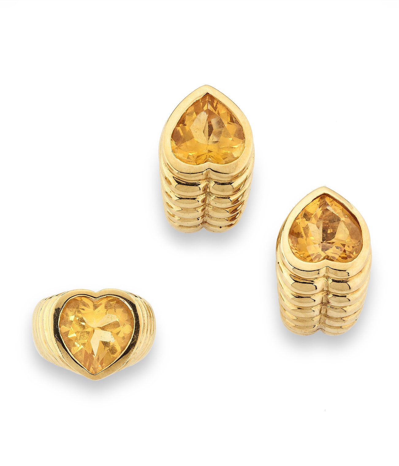 Comprising: a pair of ear clips, each set with a heart-shaped citrine, length approximately 25mm, and a ring of similar design, size 54.