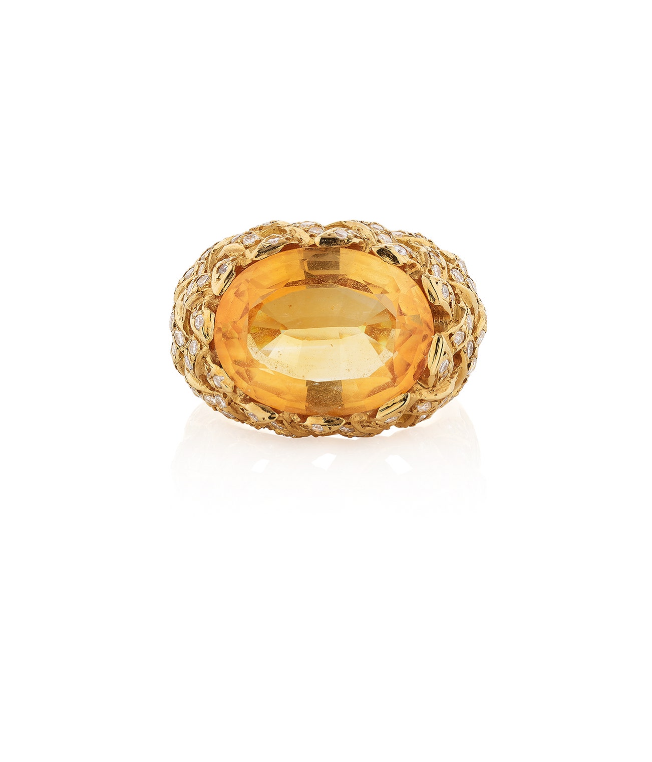 Set with an oval citrine, framed with brilliant-cut diamond open-work shoulders,