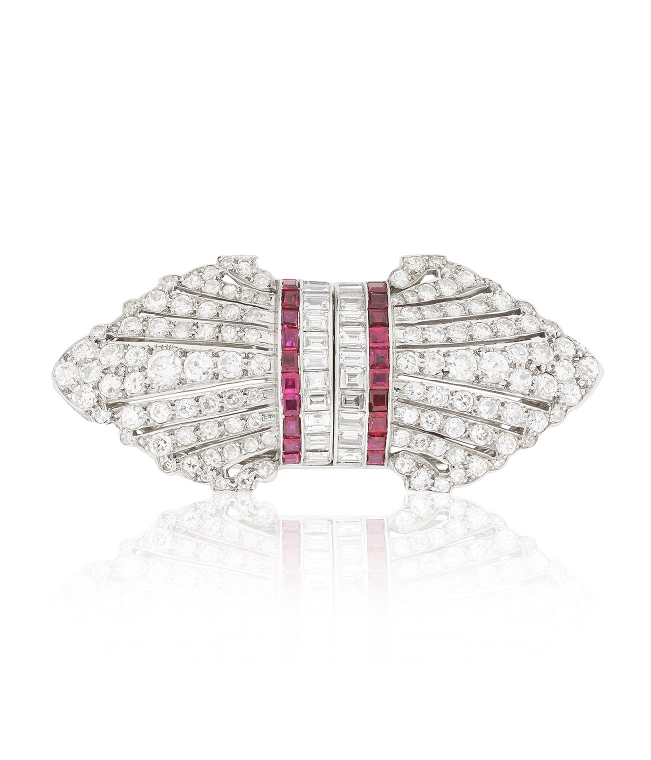Modelled as a bow, with calibré-cut rubies, highlighted with circular-cut and baguette diamonds, measuring approximately 55 x 25mm, may be worn as two clips.