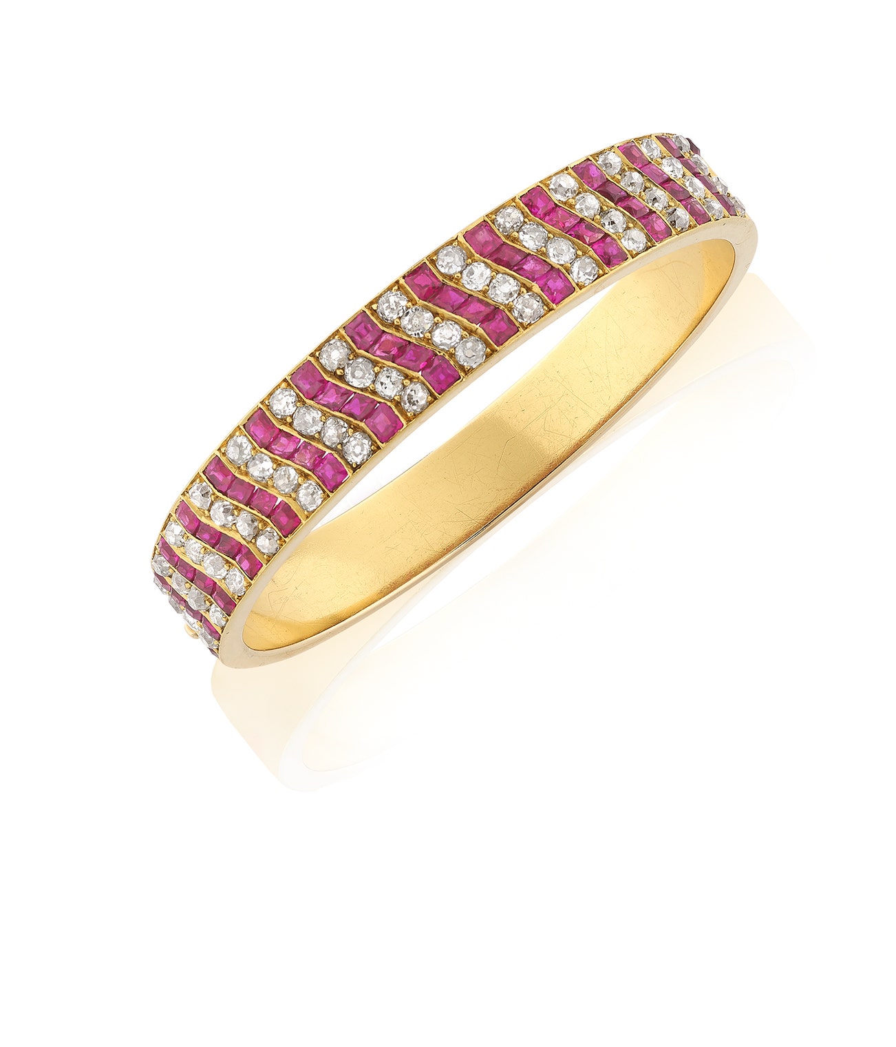 Set with calibré-cut rubies and circular-cut diamonds, inner circumference approximately 160mm.
