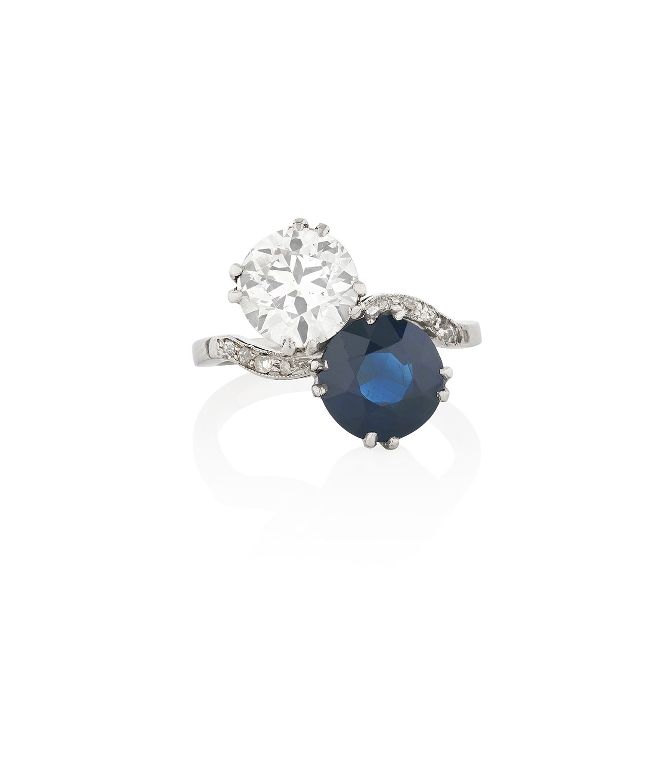 Set with a circular-cut diamond weighing 1.84 carats, and a circular-cut synthetic sapphire, accented with circular-cut diamond on the shoulders, size 51.