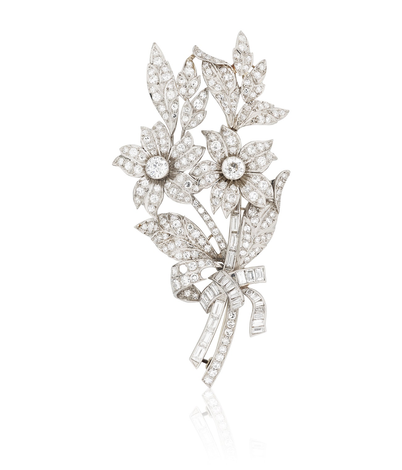 Of floral design set with circular-, single-cut and baguette diamonds, measuring approximately 80 x 40mm, one small diamond deficient.